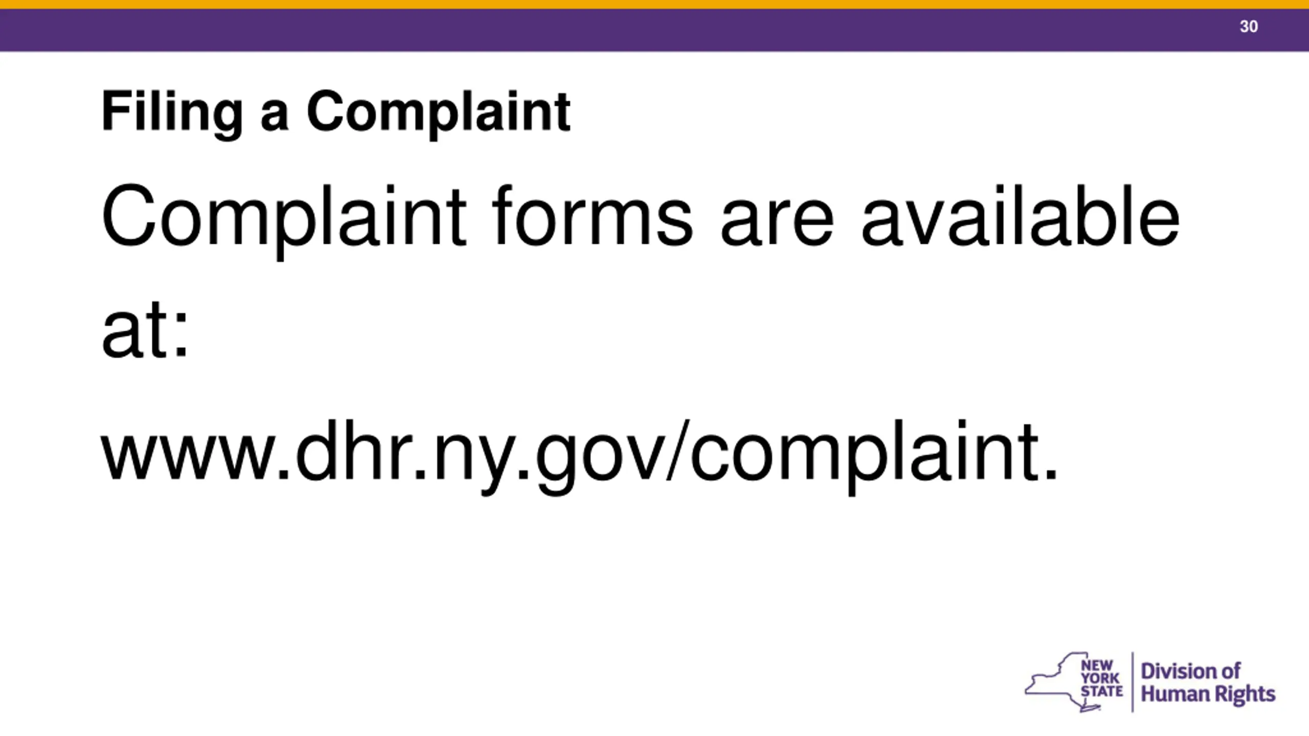 30 Filing a Complaint Complaint forms are available at: www.dhr.ny.gov/complaint.