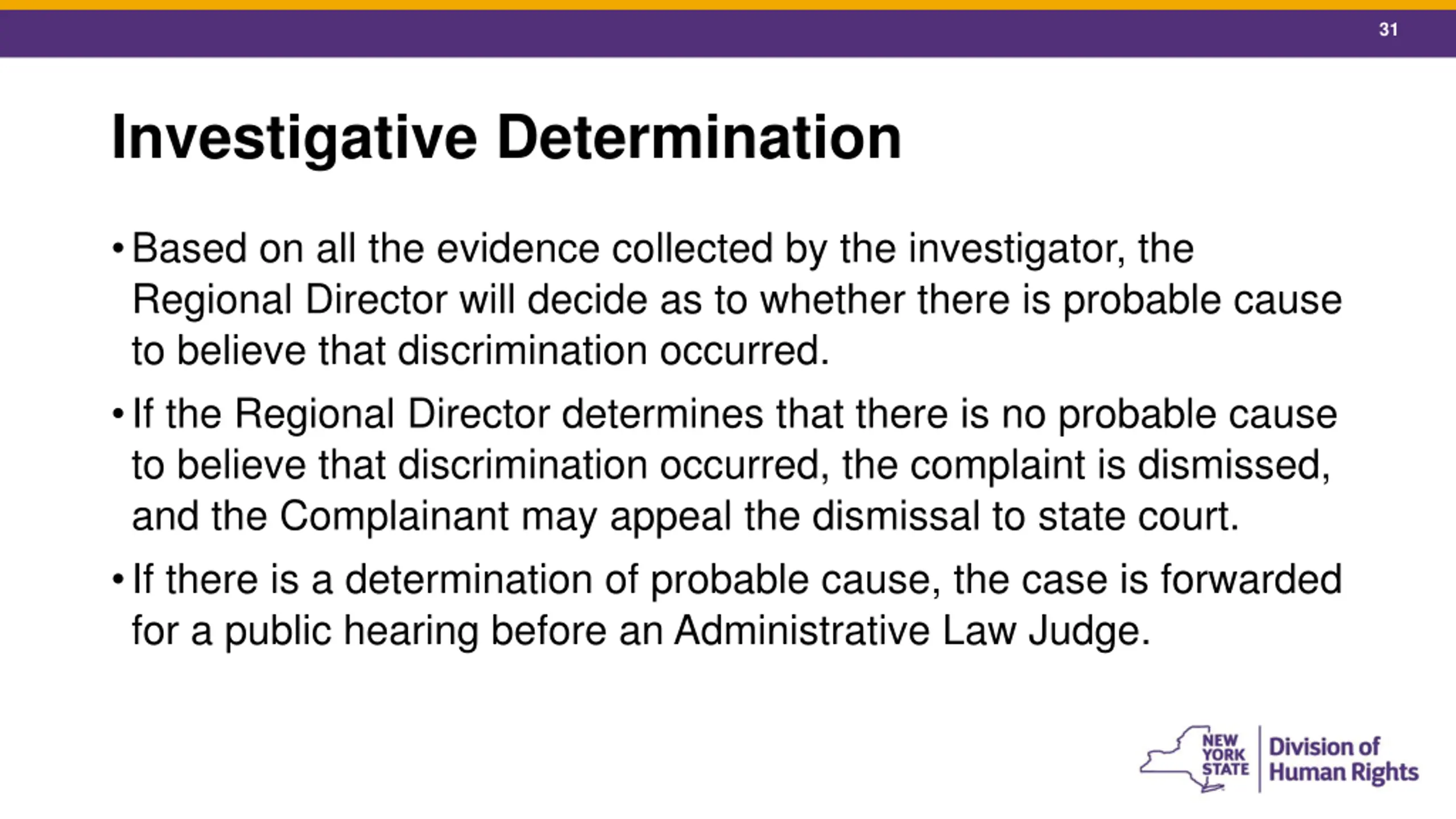31 Investigative Determination Based on all the evidence collected by the investigator, the Regional Director will decide as to whether there is probable cause to believe that discrimination occurred. If the Regional Director determines that there is no probable cause to believe that discrimination occurred, the complaint is dismissed, and the Complainant may appeal the dismissal to state court. If there is a determination of probable cause, the case is forwarded for a public hearing before an Administrative Law Judge.