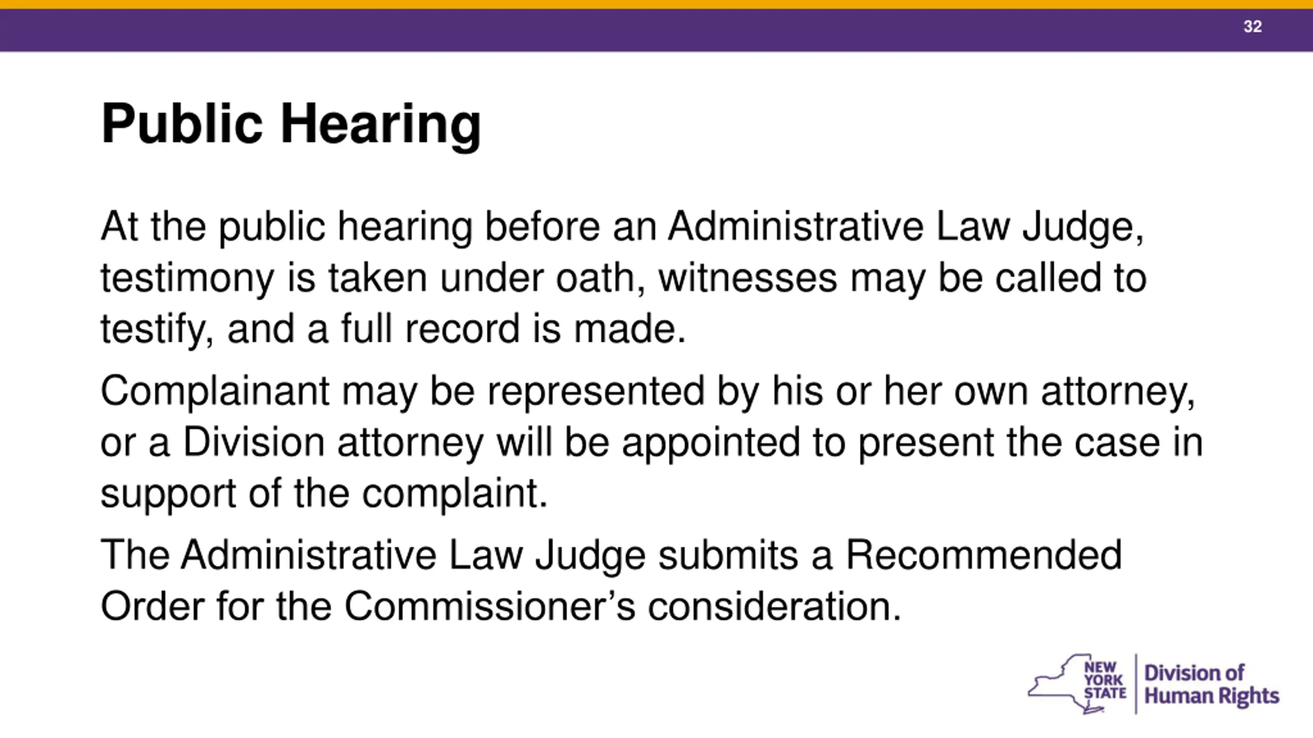 32 Public Hearing At the public hearing before an Administrative Law Judge, testimony is taken under oath, witnesses may be called to testify, and a full record is made. Complainant may be represented by his or her own attorney, or a Division attorney will be appointed to present the case in support of the complaint. The Administrative Law Judge submits a Recommended Order for the Commissioner s consideration.
