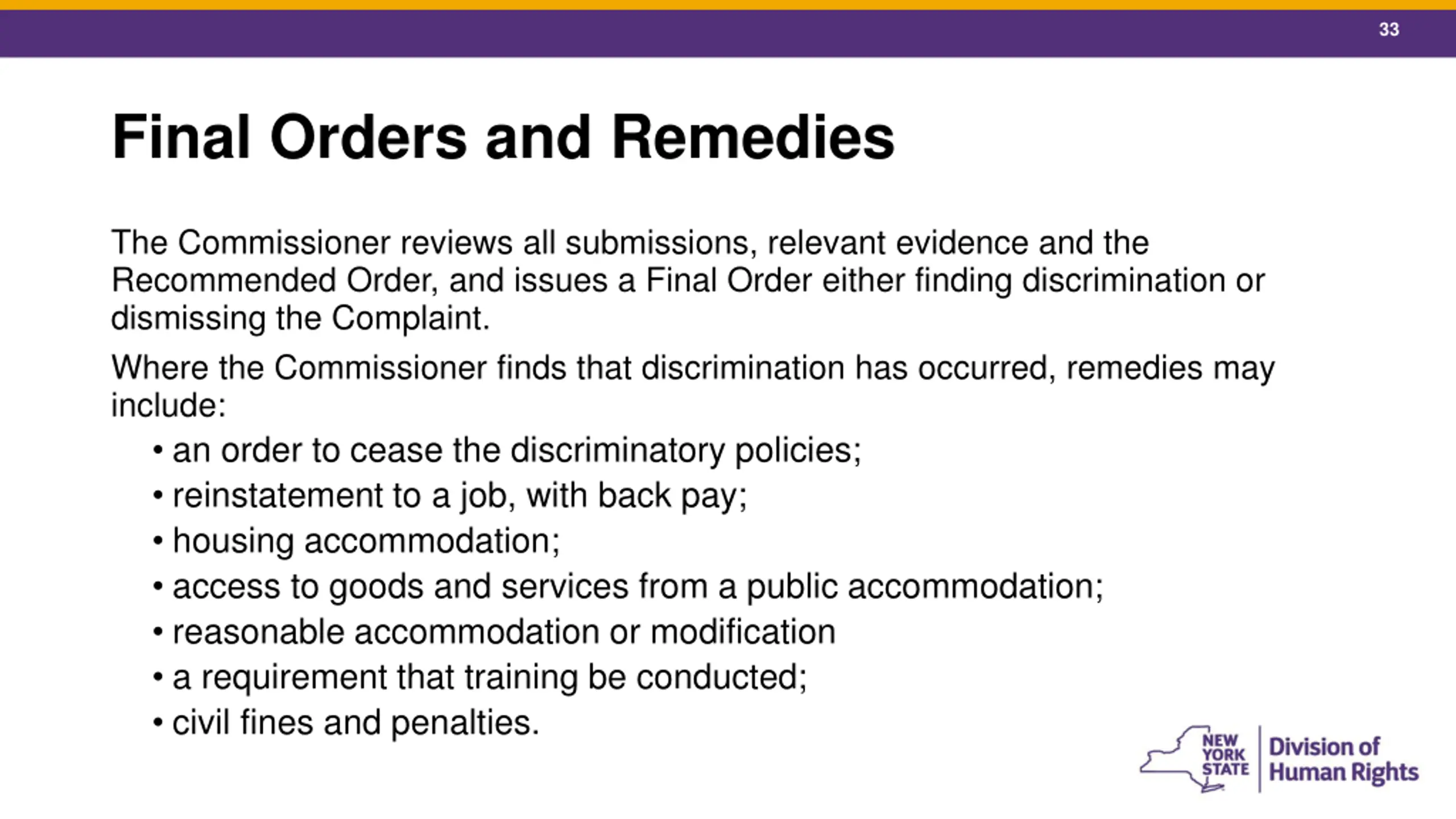33 Final Orders and Remedies The Commissioner reviews all submissions, relevant evidence and the Recommended Order, and issues a Final Order either finding discrimination or dismissing the Complaint. Where the Commissioner finds that discrimination has occurred, remedies may include: an order to cease the discriminatory policies; reinstatement to a job, with back pay; housing accommodation; access to goods and services from a public accommodation; reasonable accommodation or modification a requirement that training be conducted; civil fines and penalties.