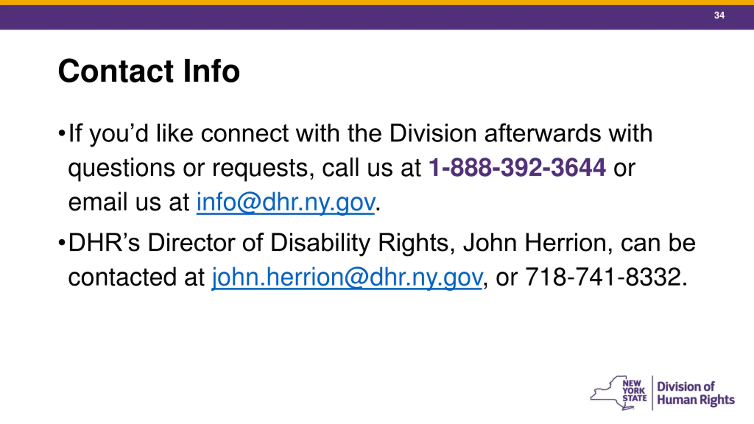 34 Contact Info If you d like connect with the Division afterwards with questions or requests, call us at 1-888-392-3644 or email us at info@dhr.ny.gov. DHR s Director of Disability Rights, John Herrion, can be contacted at john.herrion@dhr.ny.gov, or 718-741-8332.