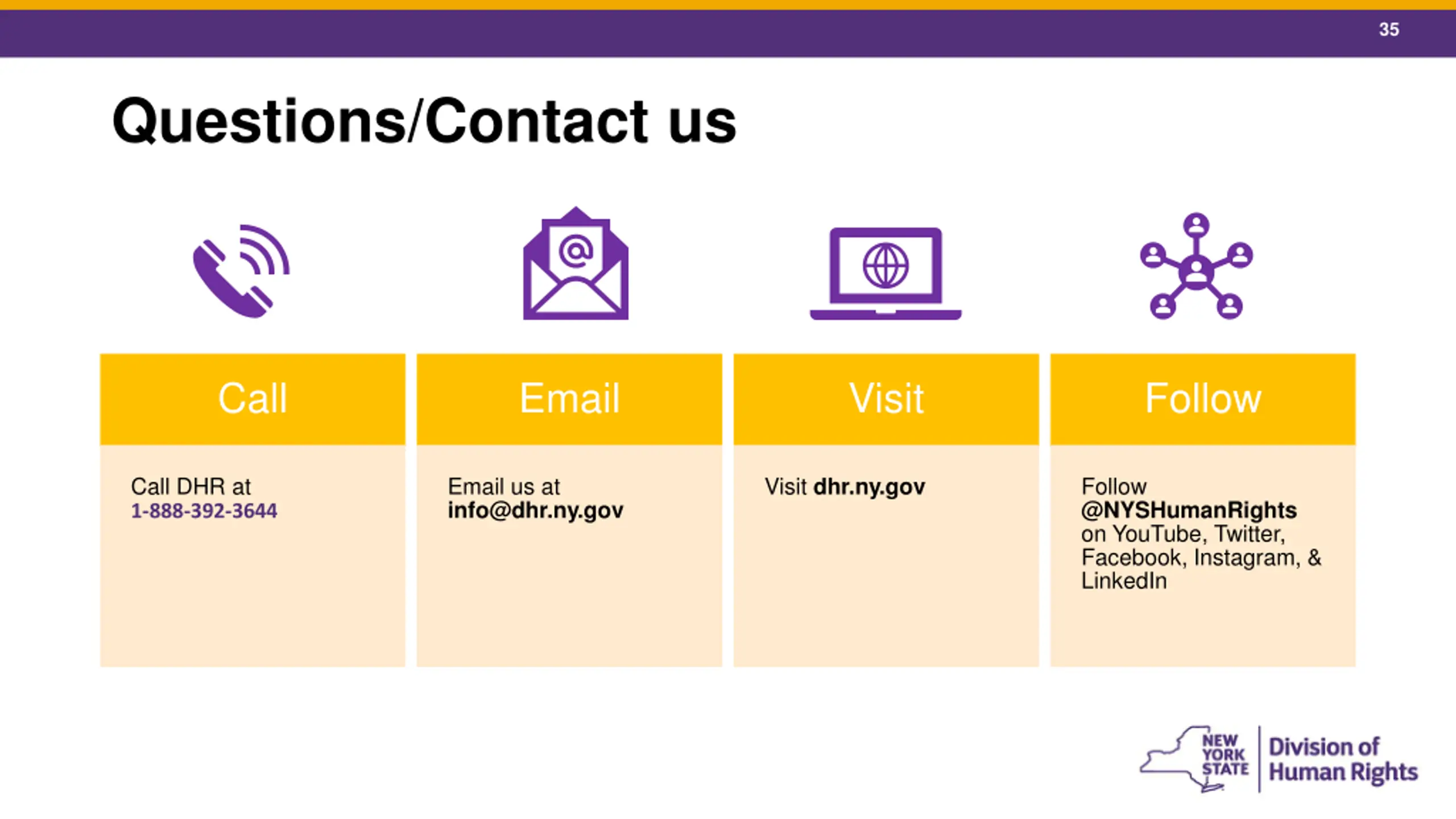 35 Questions/Contact us Call Email Visit Follow Call DHR at 1-888-392-3644 Email us at info@dhr.ny.gov Visit dhr.ny.gov Follow @NYSHumanRights on YouTube, Twitter, Facebook, Instagram, & LinkedIn