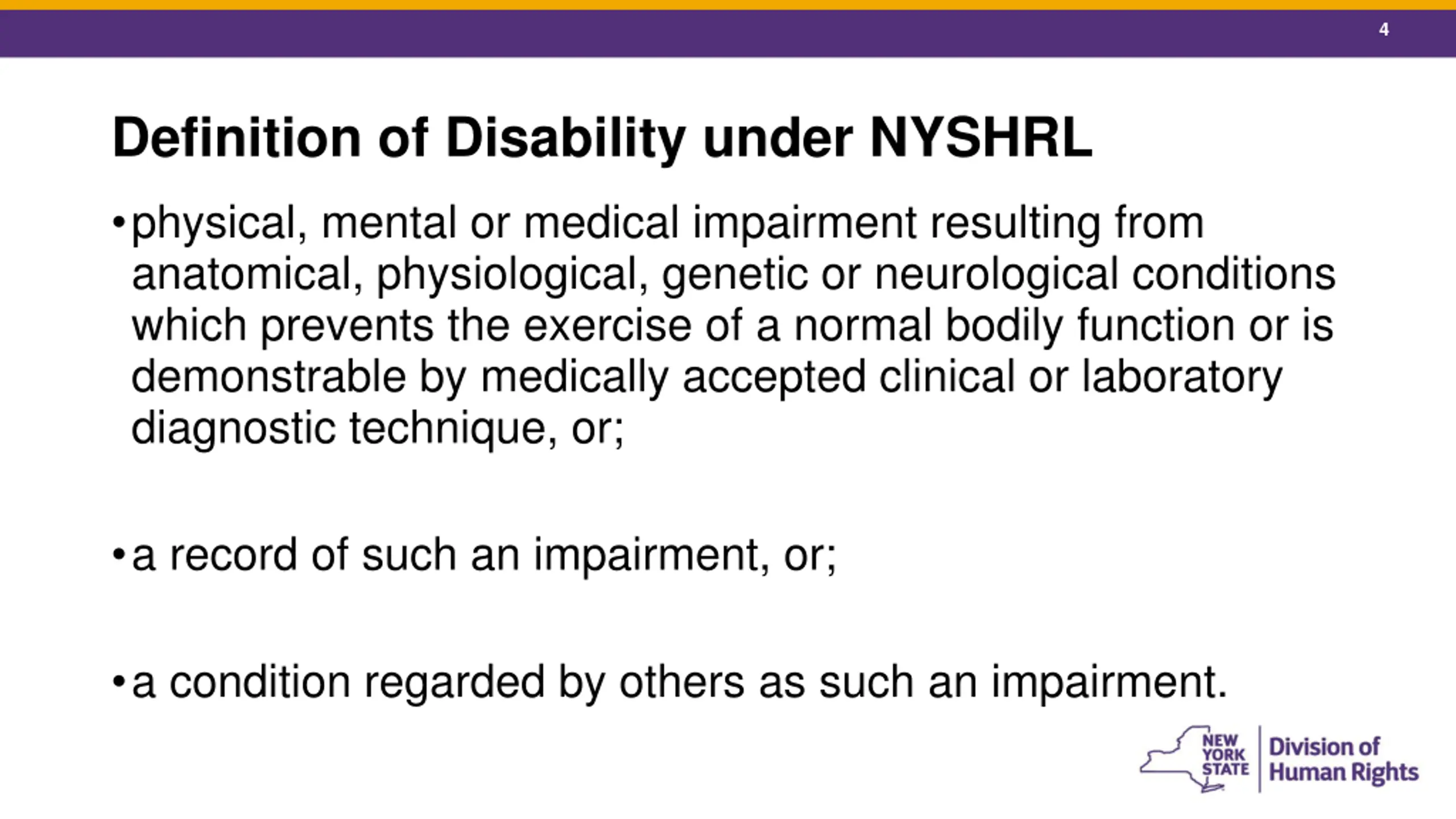 4 Definition of Disability under NYSHRL physical, mental or medical impairment resulting from anatomical, physiological, genetic or neurological conditions which prevents the exercise of a normal bodily function or is demonstrable by medically accepted clinical or laboratory diagnostic technique, or; a record of such an impairment, or; a condition regarded by others as such an impairment.