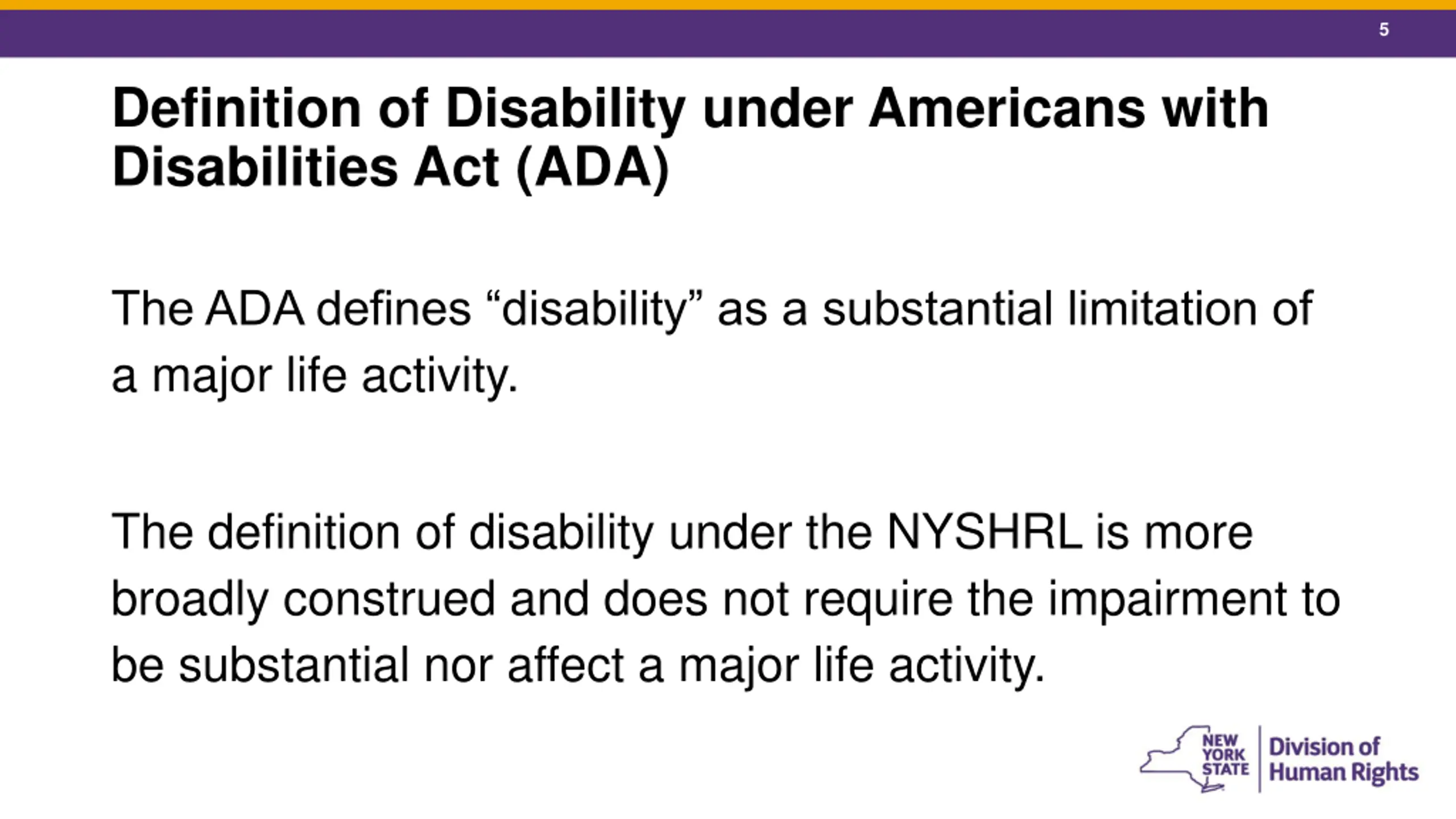 5 Definition of Disability under Americans with Disabilities Act (ADA) The ADA defines disability as a substantial limitation of a major life activity. The definition of disability under the NYSHRL is more broadly construed and does not require the impairment to be substantial nor affect a major life activity.