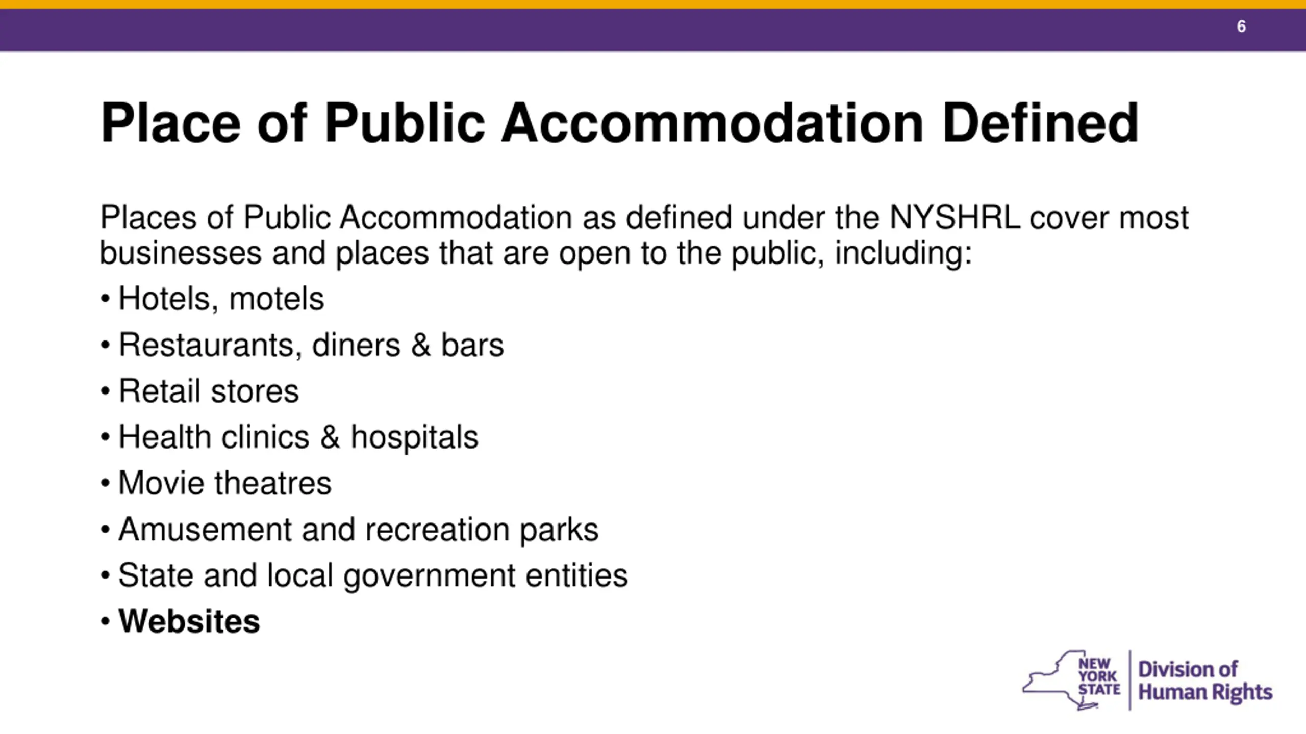 6 Place of Public Accommodation Defined Places of Public Accommodation as defined under the NYSHRL cover most businesses and places that are open to the public, including: Hotels, motels Restaurants, diners & bars Retail stores Health clinics & hospitals Movie theatres Amusement and recreation parks State and local government entities Websites