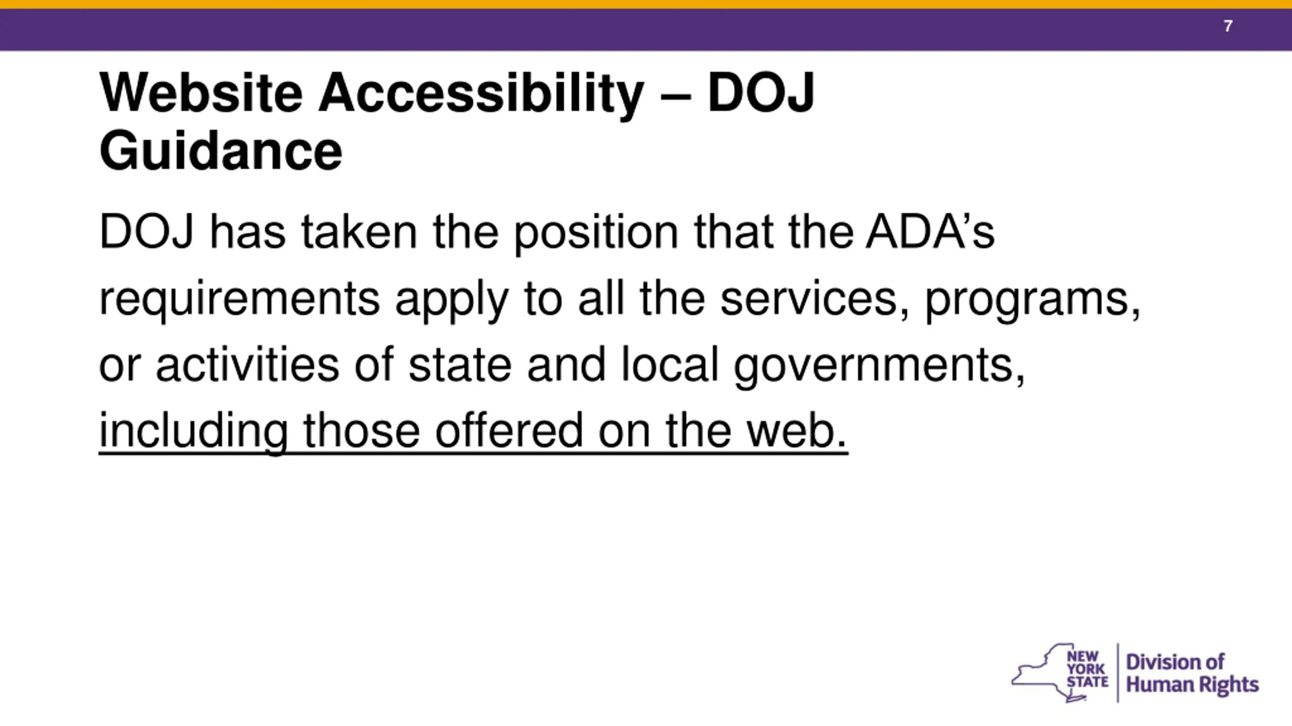 7 Website Accessibility DOJ Guidance DOJ has taken the position that the ADA s requirements apply to all the services, programs, or activities of state and local governments, including those offered on the web.