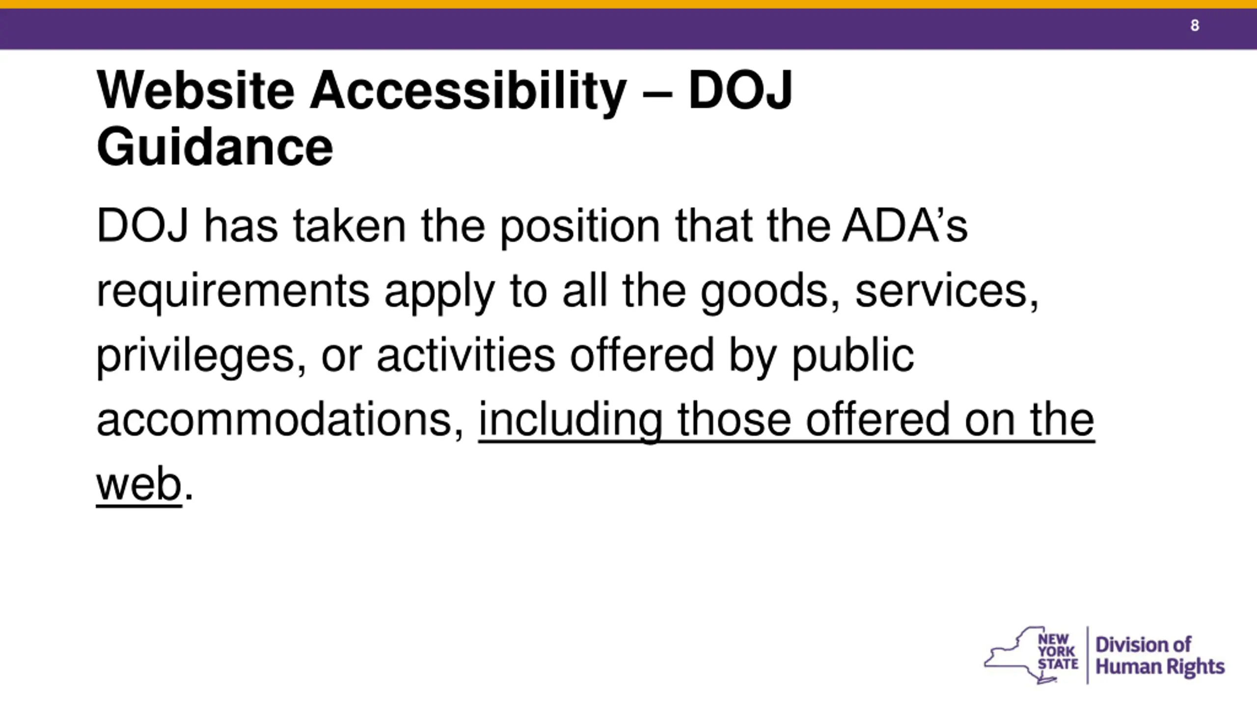 8 Website Accessibility DOJ Guidance DOJ has taken the position that the ADA s requirements apply to all the goods, services, privileges, or activities offered by public accommodations, including those offered on the web.