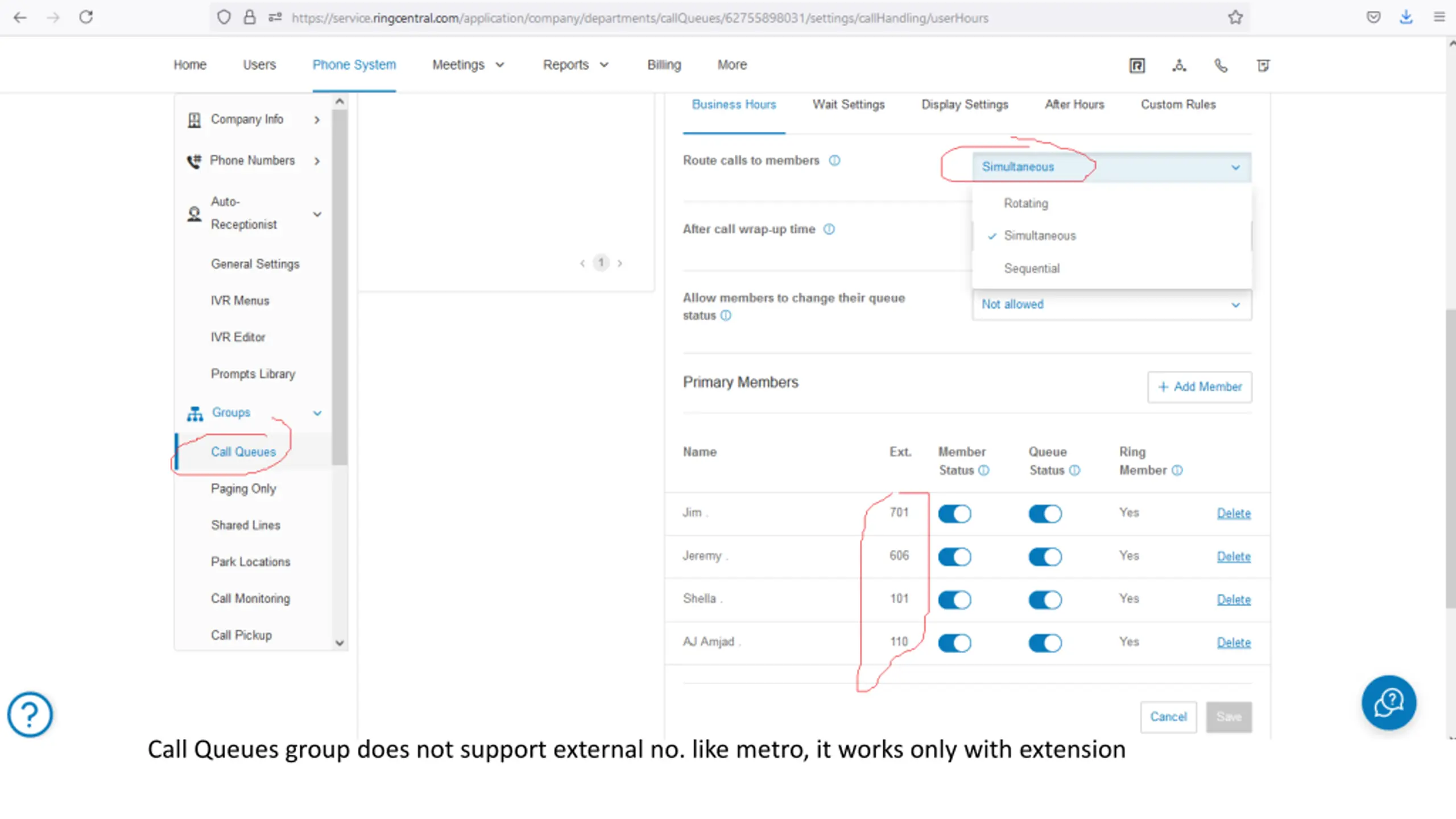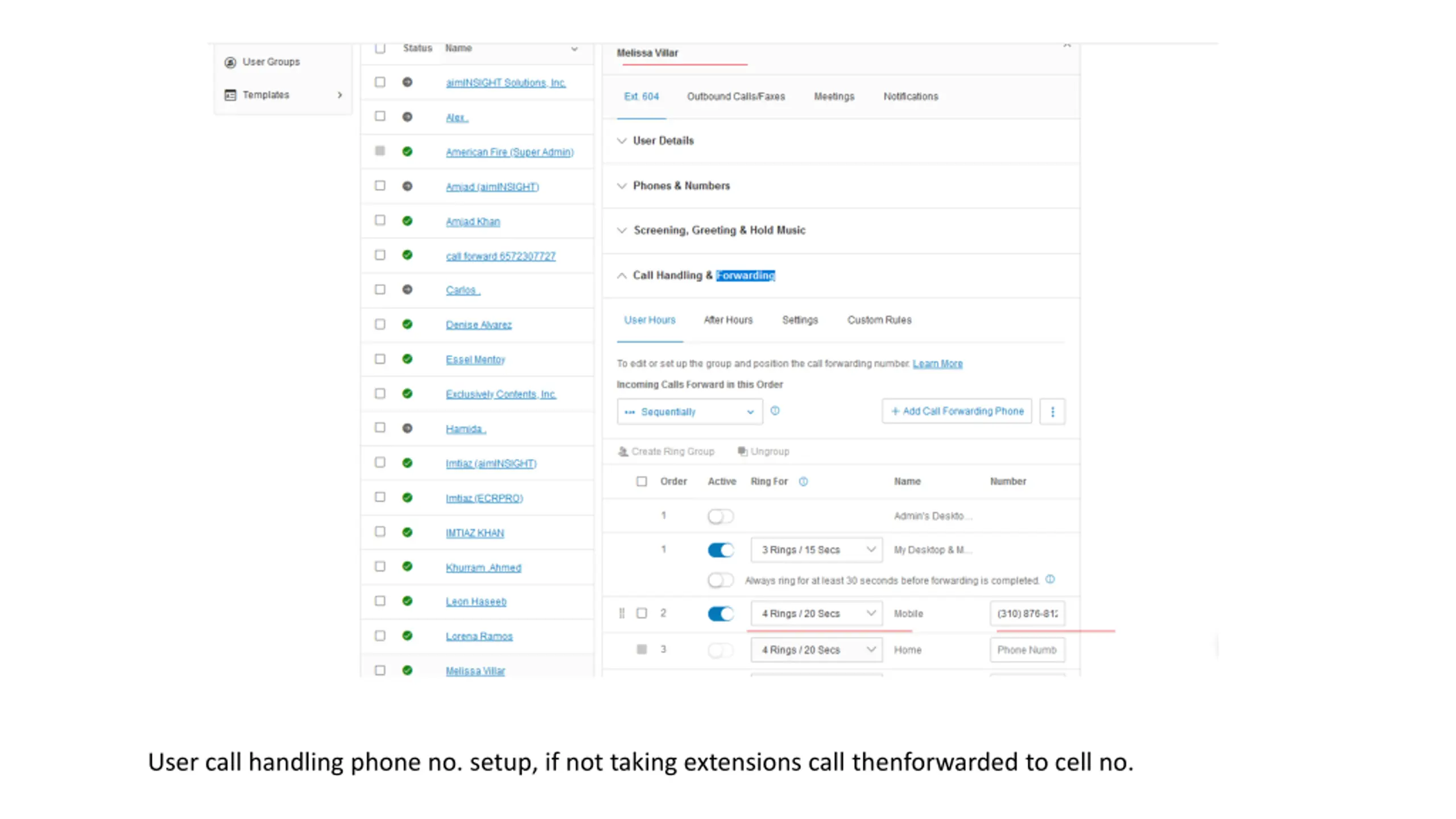 User call handling phone no. setup, if not taking extensions call thenforwarded to cell no.