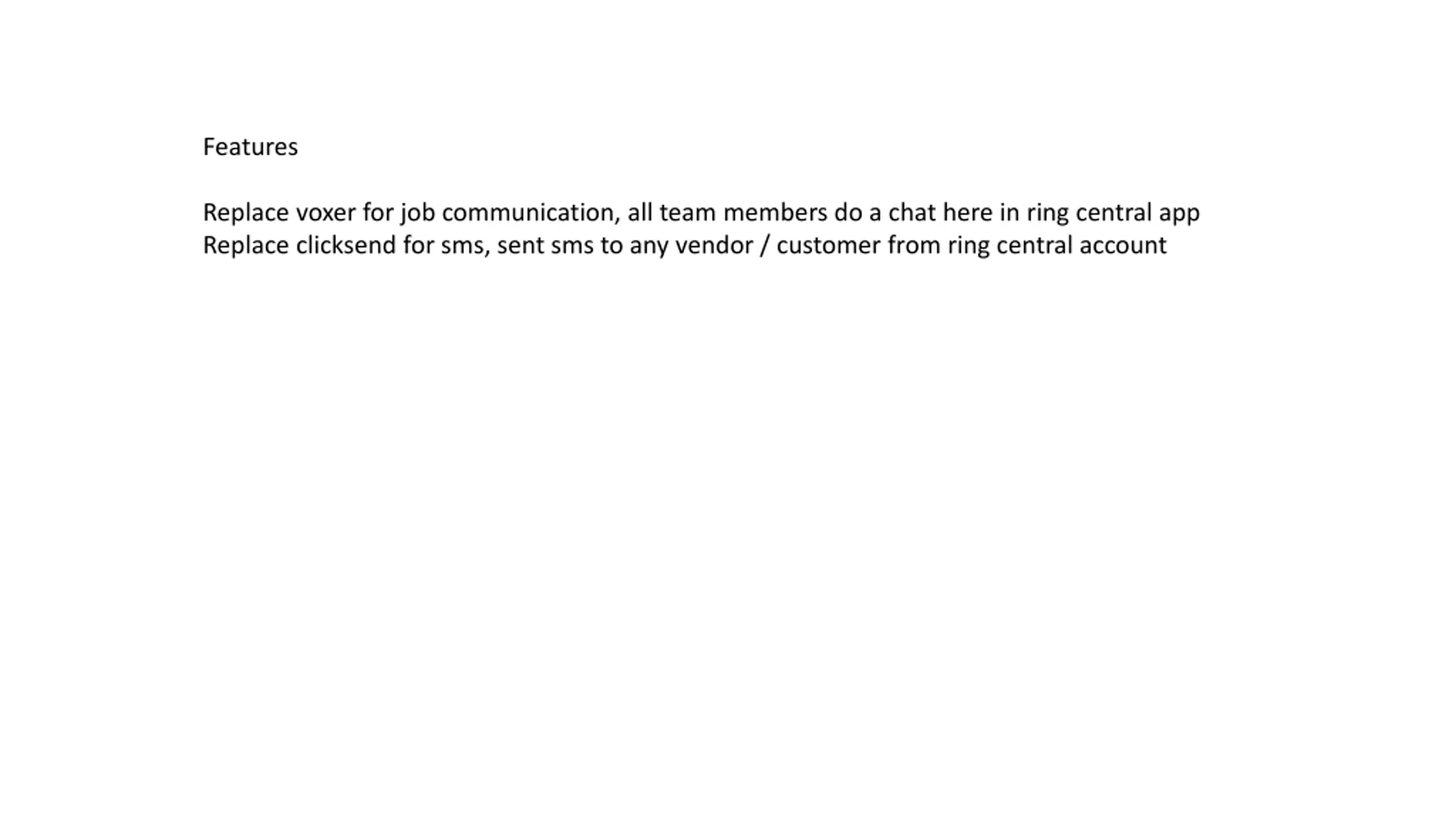 Features Replace voxer for job communication, all team members do a chat here in ring central app Replace clicksend for sms, sent sms to any vendor / customer from ring central account