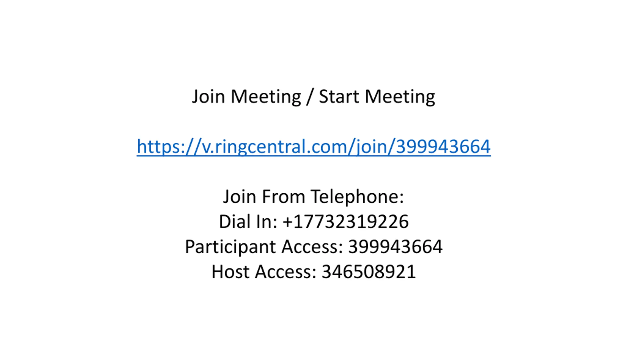 Join Meeting / Start Meeting https://v.ringcentral.com/join/399943664 Join From Telephone: Dial In: +17732319226 Participant Access: 399943664 Host Access: 346508921