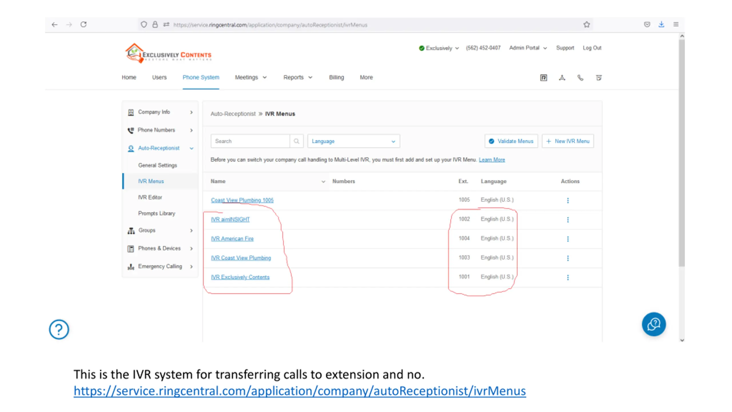 This is the IVR system for transferring calls to extension and no. https://service.ringcentral.com/application/company/autoReceptionist/ivrMenus