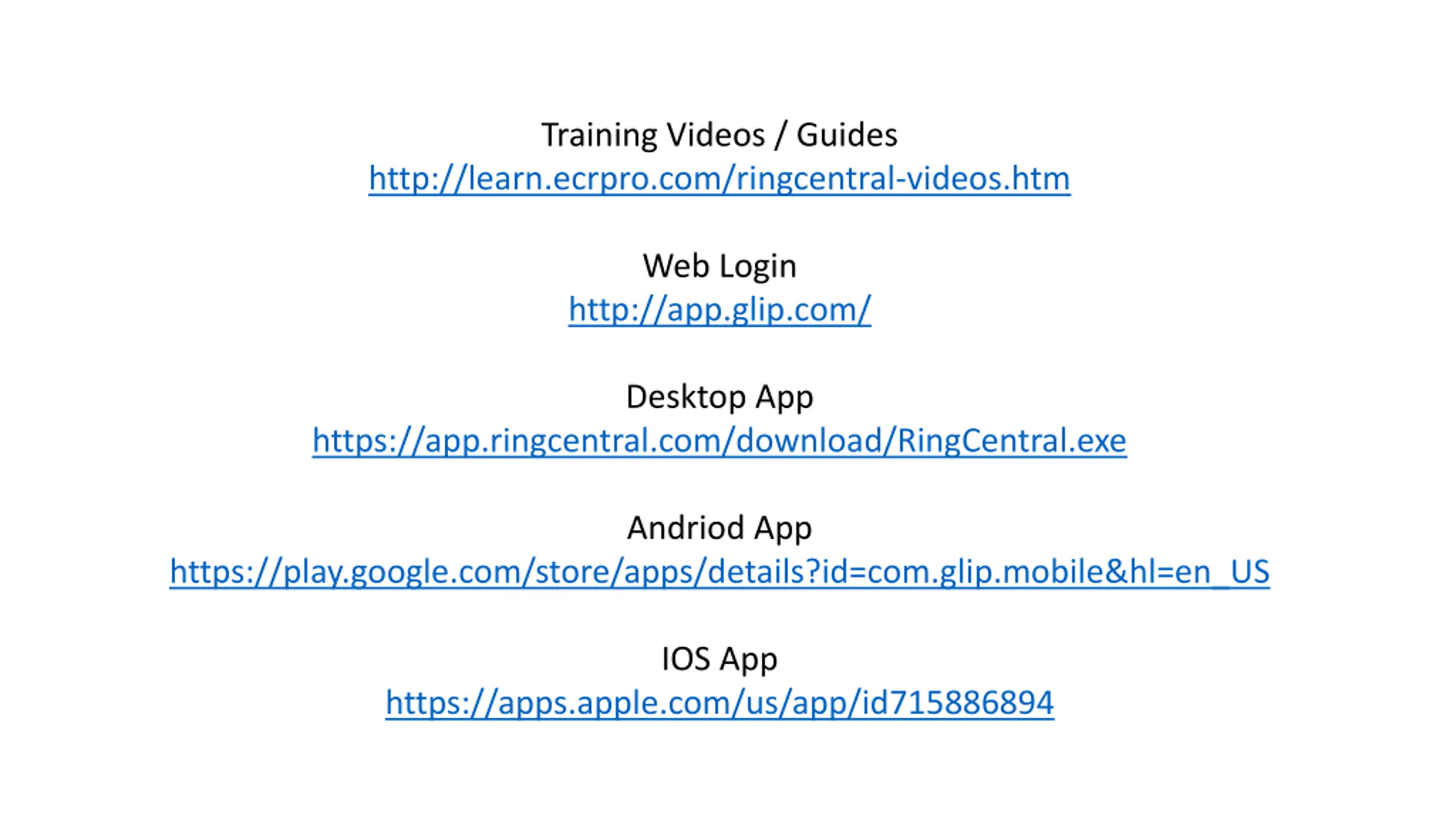 Training Videos / Guides http://learn.ecrpro.com/ringcentral-videos.htm Web Login http://app.glip.com/ Desktop App https://app.ringcentral.com/download/RingCentral.exe Andriod App https://play.google.com/store/apps/details?id=com.glip.mobile&hl=en_US IOS App https://apps.apple.com/us/app/id715886894