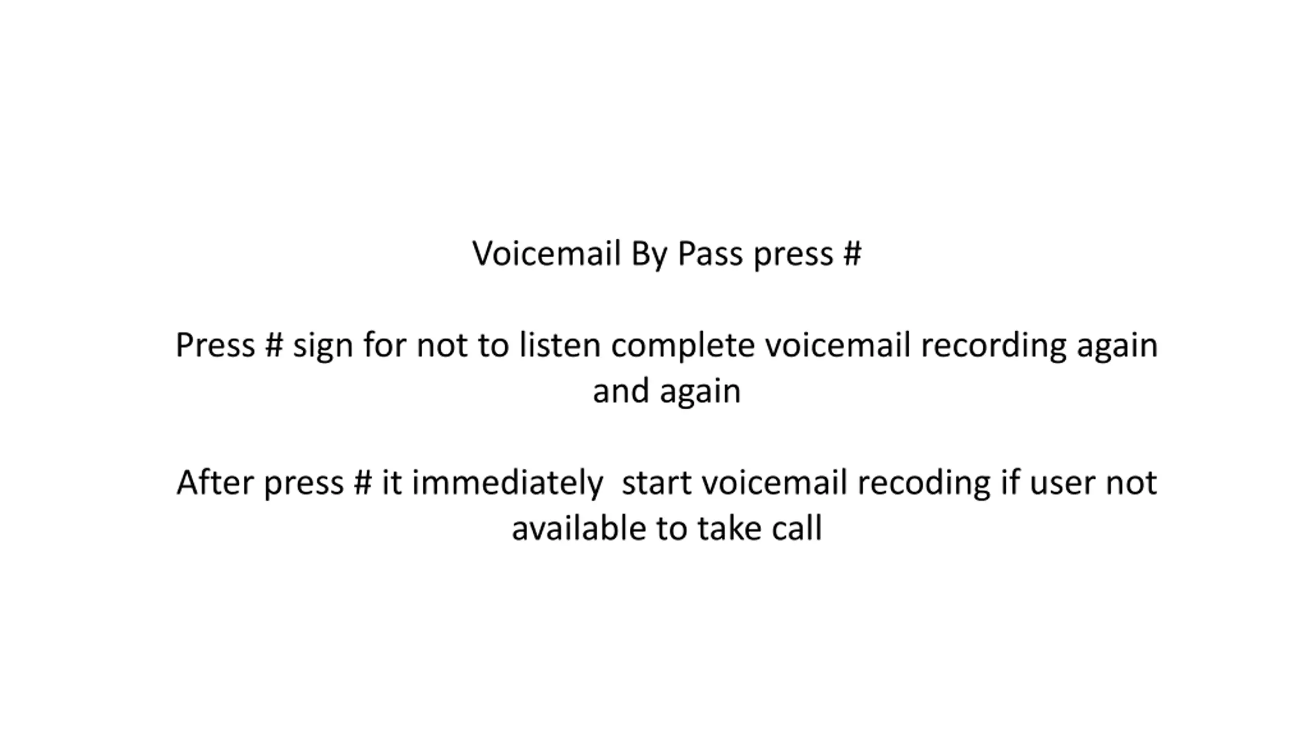Voicemail By Pass press # Press # sign for not to listen complete voicemail recording again and again After press # it immediately start voicemail recoding if user not available to take call