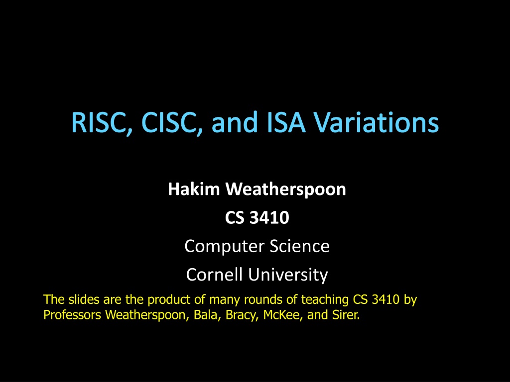 RISC, CISC, and ISA Variations Hakim Weatherspoon CS 3410 Computer Science Cornell University The slides are the product of many rounds of teaching CS 3410 by Professors Weatherspoon, Bala, Bracy, McKee, and Sirer.