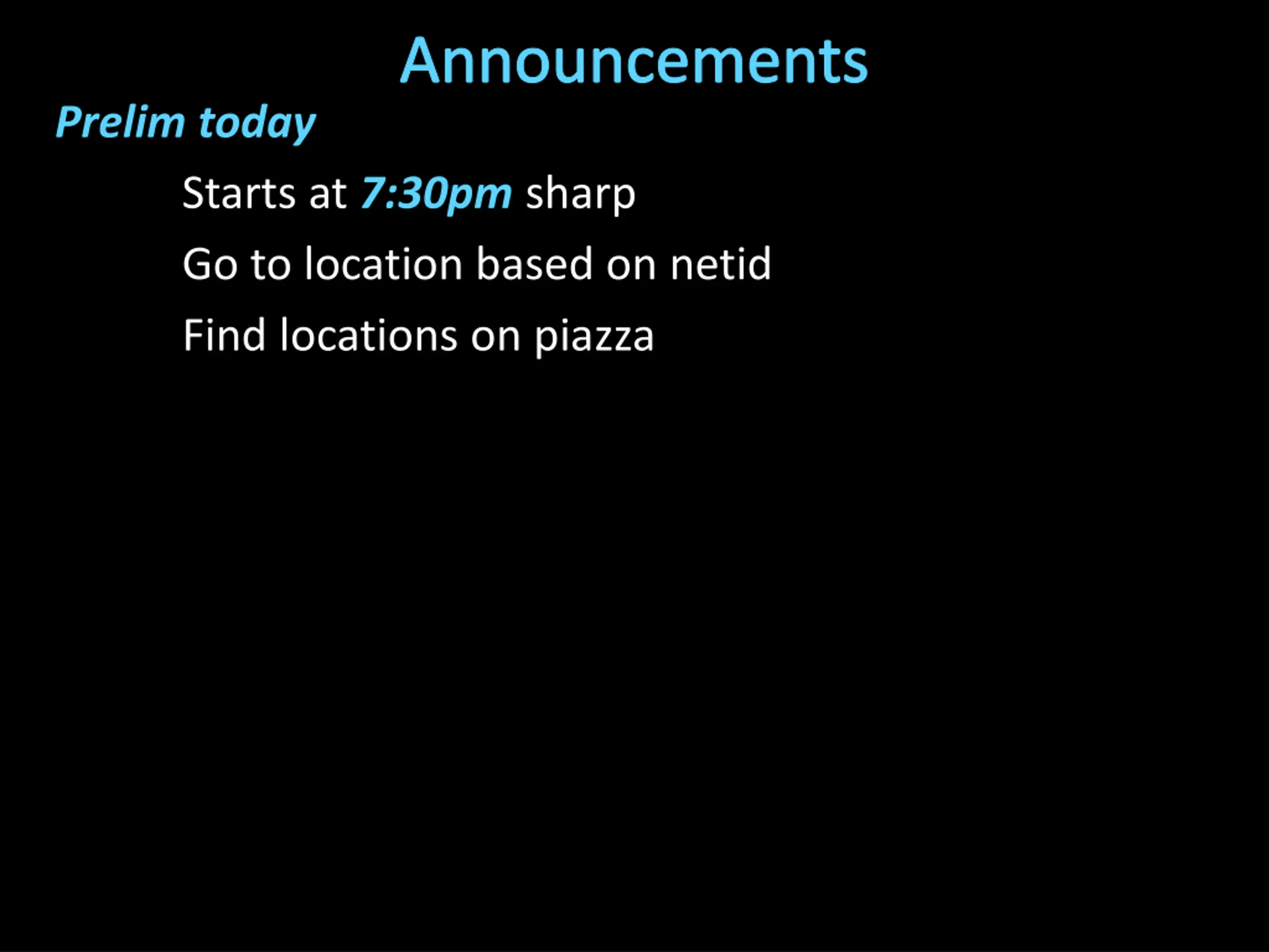 Announcements Prelim today Starts at 7:30pm sharp Go to location based on netid Find locations on piazza