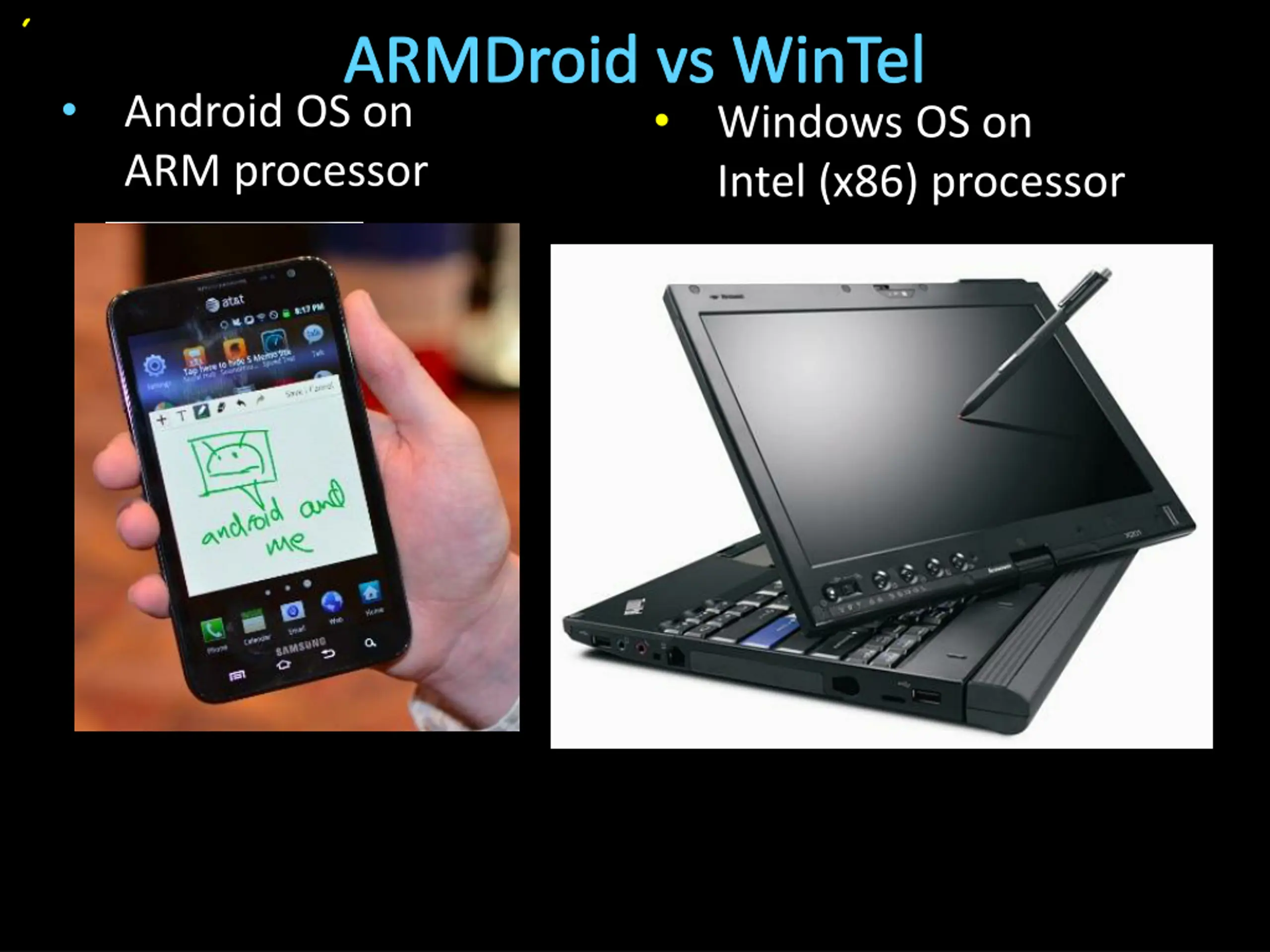 ARMDroid vs WinTel Android OS on ARM processor Windows OS on Intel (x86) processor