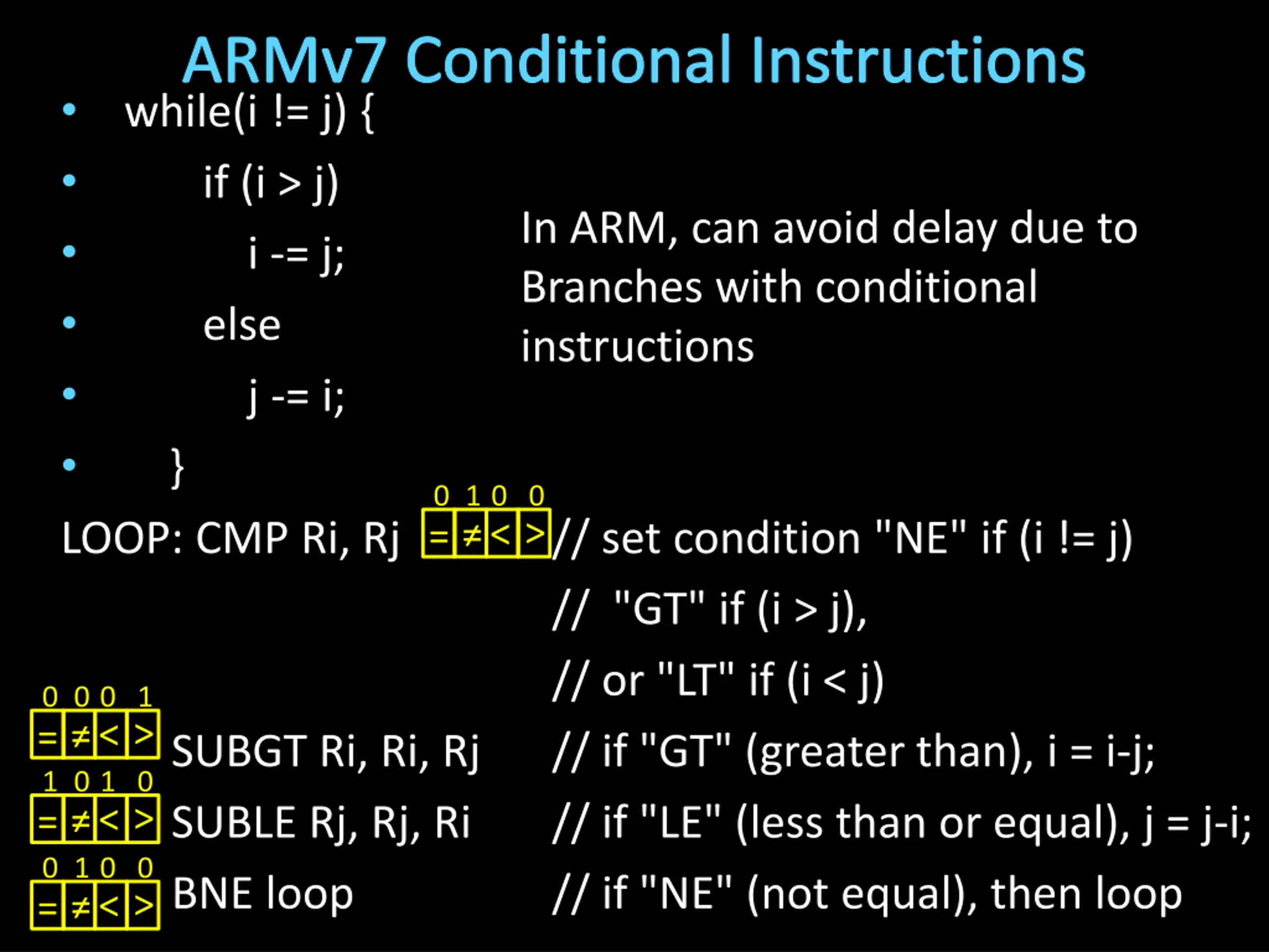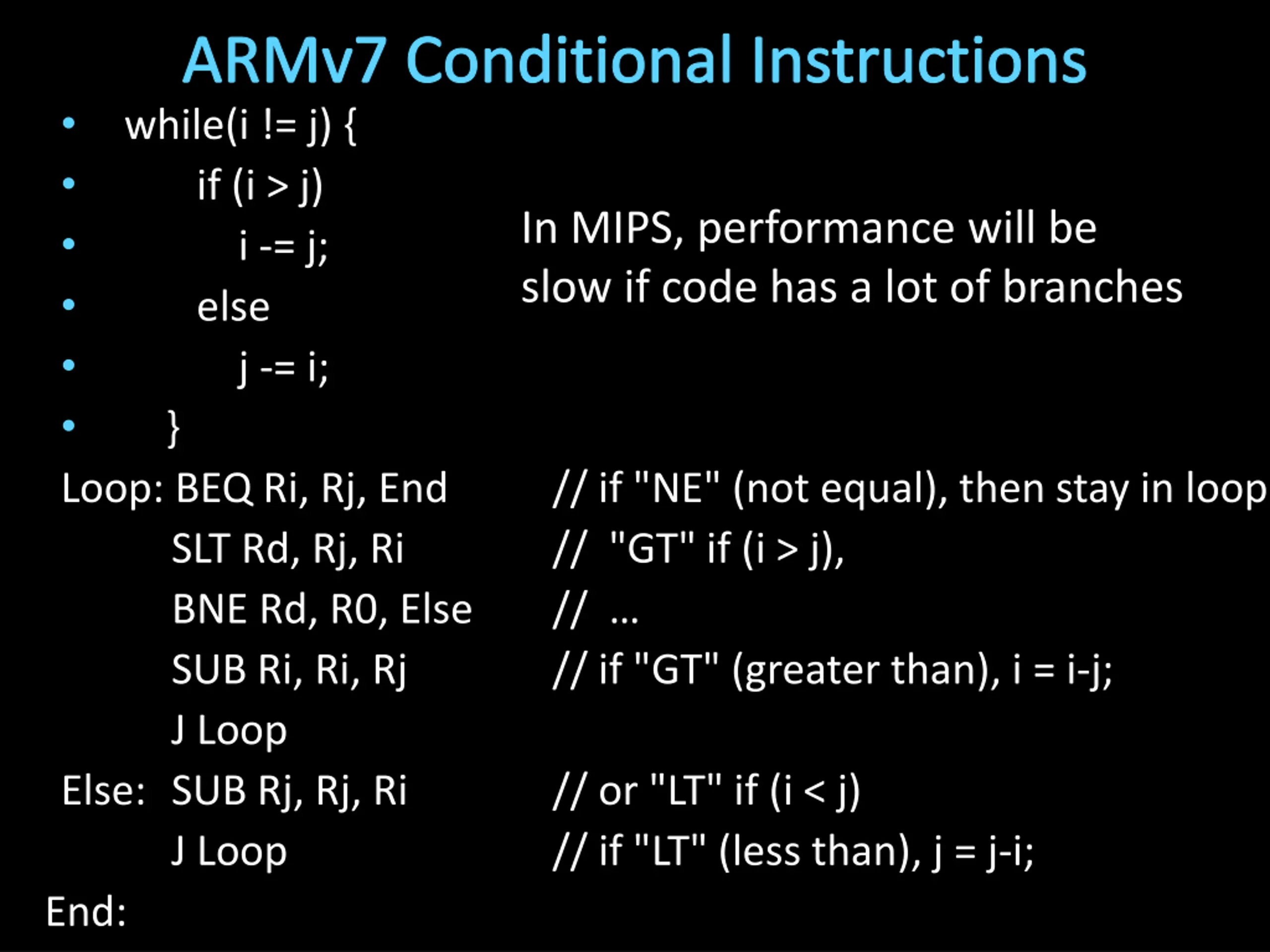 ARMv7 Conditional Instructions Loop: BEQ Ri, Rj, End SLT Rd, Rj, Ri BNE Rd, R0, Else SUB Ri, Ri, Rj J Loop Else: SUB Rj, Rj, Ri J Loop End: while(i != j) { if (i > j) i -= j; else j -= i; } In MIPS, performance will be slow if code has a lot of branches // if "NE" (not equal), then stay in loop // "GT" if (i > j), // // if "GT" (greater than), i = i-j; // or "LT" if (i < j) // if "LT" (less than), j = j-i;