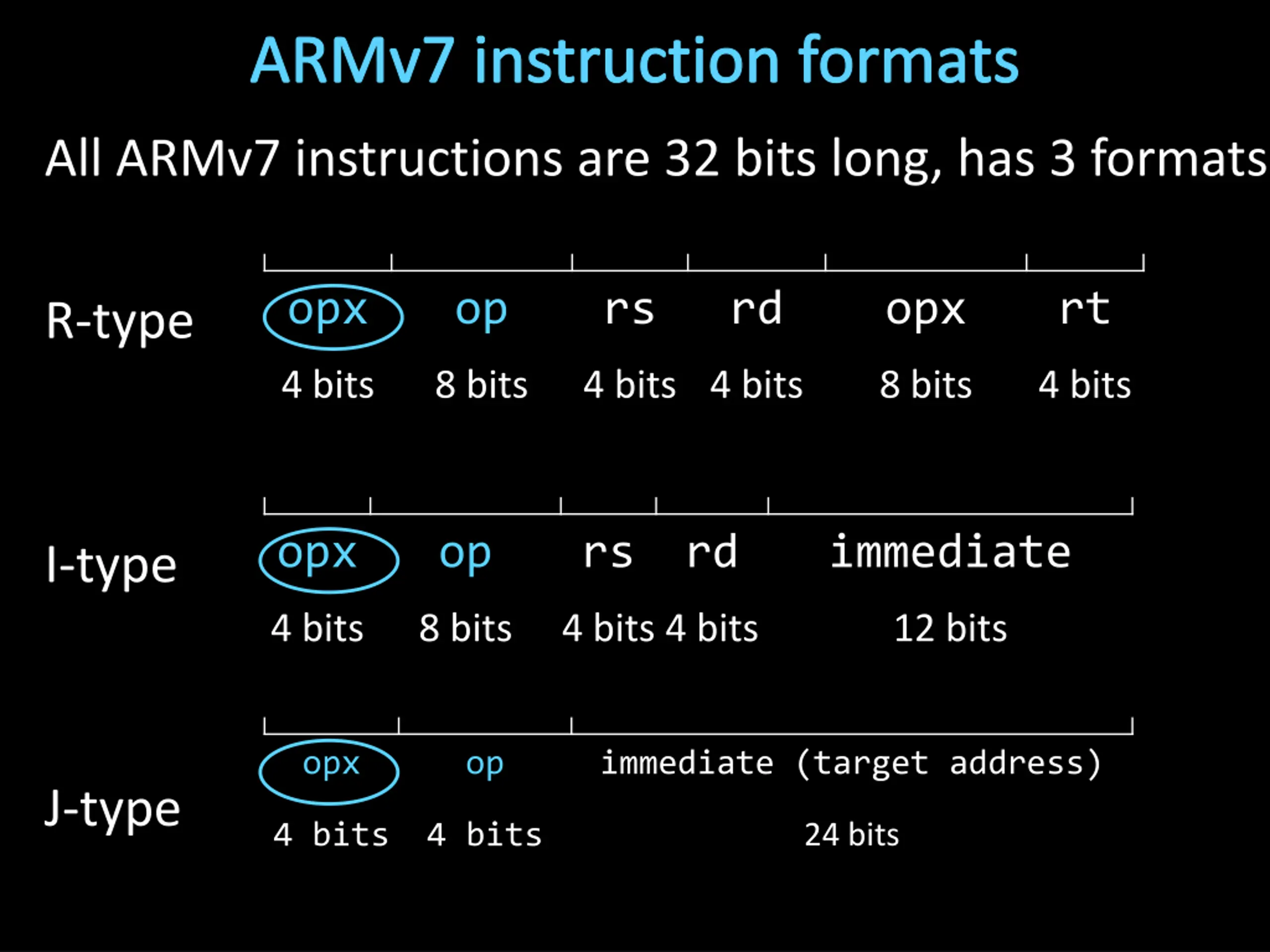 ARMv7 instruction formats All ARMv7 instructions are 32 bits long, has 3 formats opx op rs rd opx rt R-type 4 bits 8 bits 4 bits 4 bits 8 bits 4 bits opx op rs rd immediate I-type 4 bits 8 bits 4 bits 4 bits 12 bits opx op immediate (target address) J-type 24 bits 4 bits 4 bits
