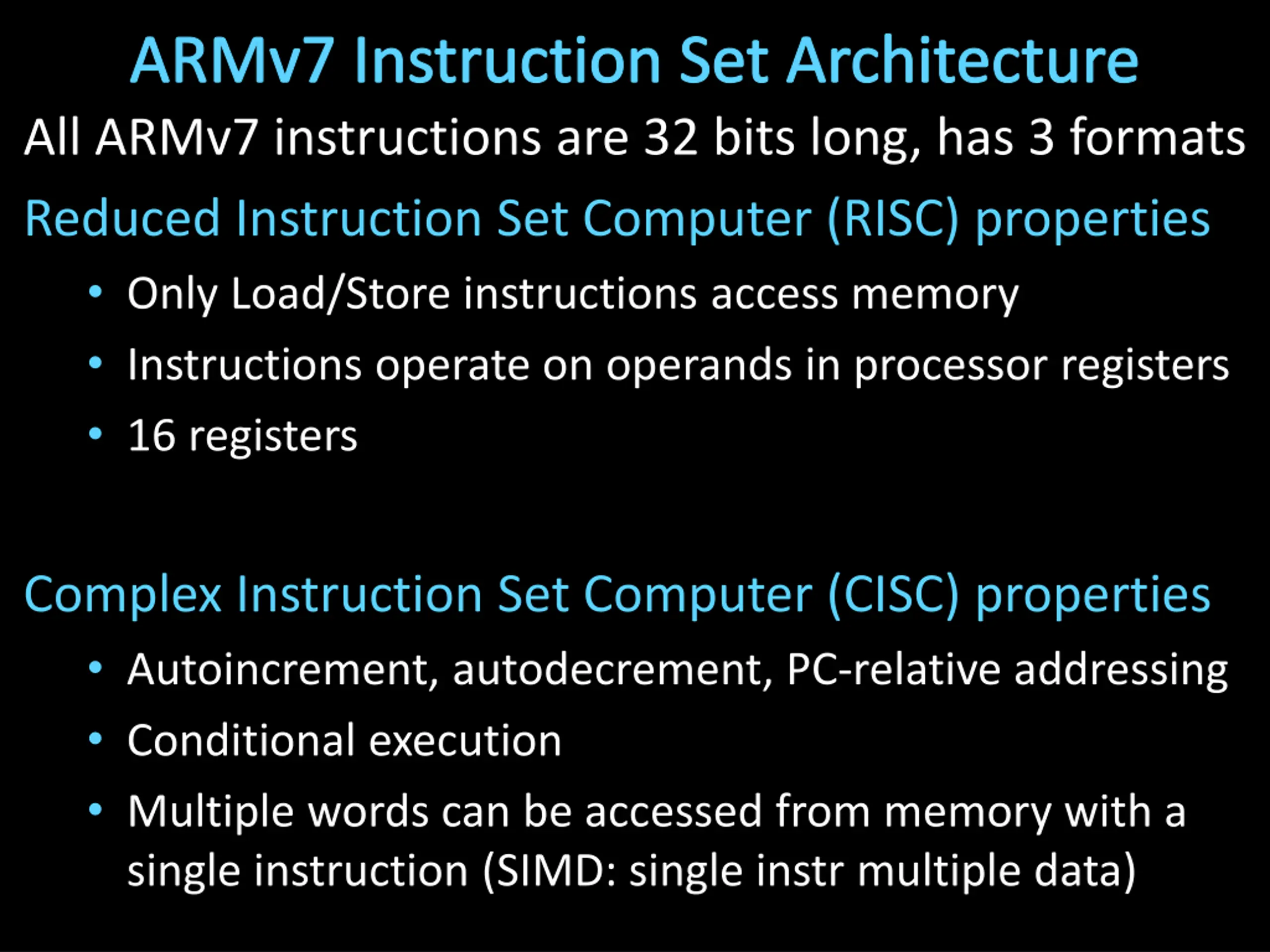 ARMv7 Instruction Set Architecture All ARMv7 instructions are 32 bits long, has 3 formats Reduced Instruction Set Computer (RISC) properties Only Load/Store instructions access memory Instructions operate on operands in processor registers 16 registers Complex Instruction Set Computer (CISC) properties Autoincrement, autodecrement, PC-relative addressing Conditional execution Multiple words can be accessed from memory with a single instruction (SIMD: single instr multiple data)