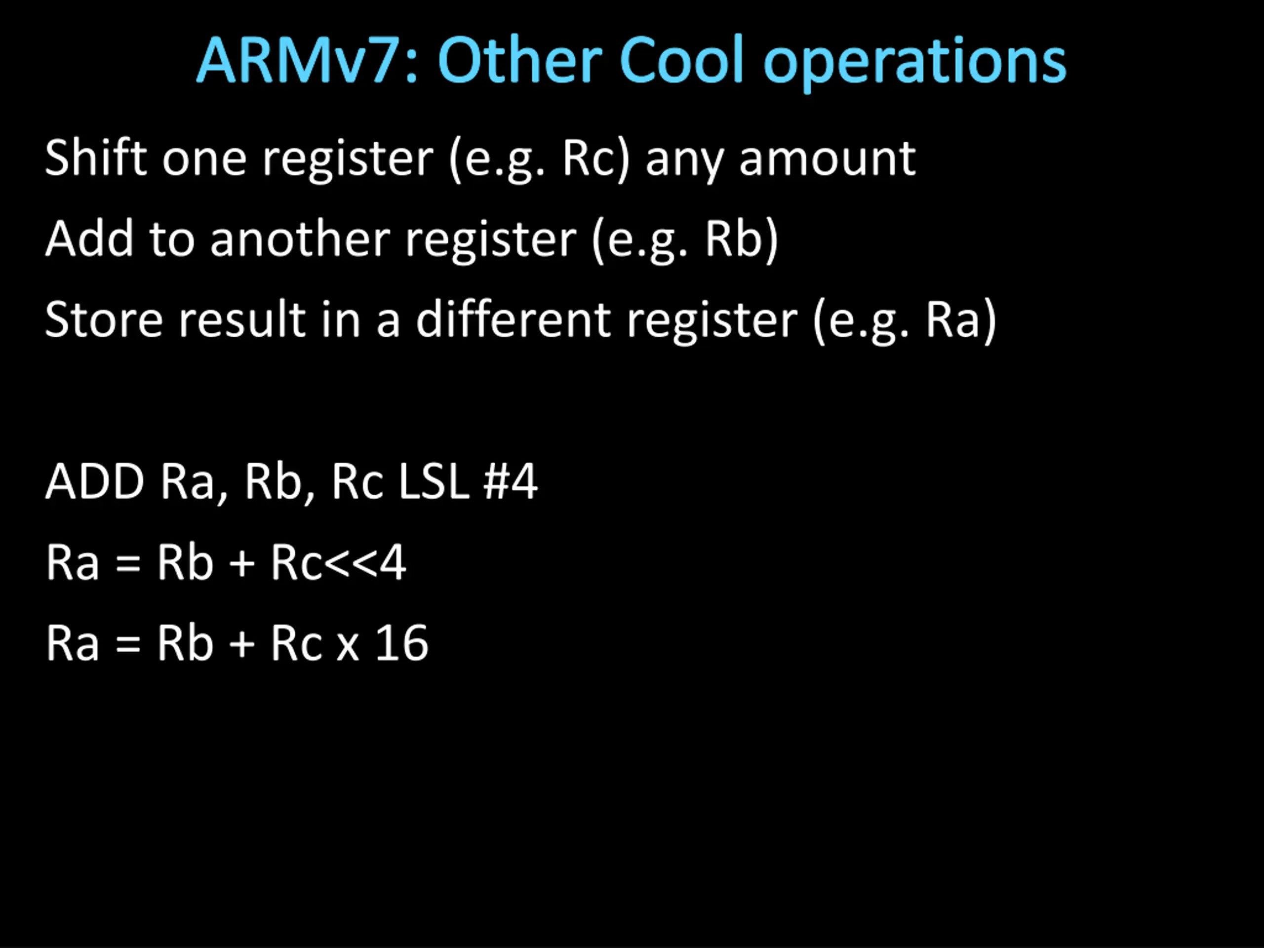 ARMv7: Other Cool operations Shift one register (e.g. Rc) any amount Add to another register (e.g. Rb) Store result in a different register (e.g. Ra) ADD Ra, Rb, Rc LSL #4 Ra = Rb + Rc<<4 Ra = Rb + Rc x 16