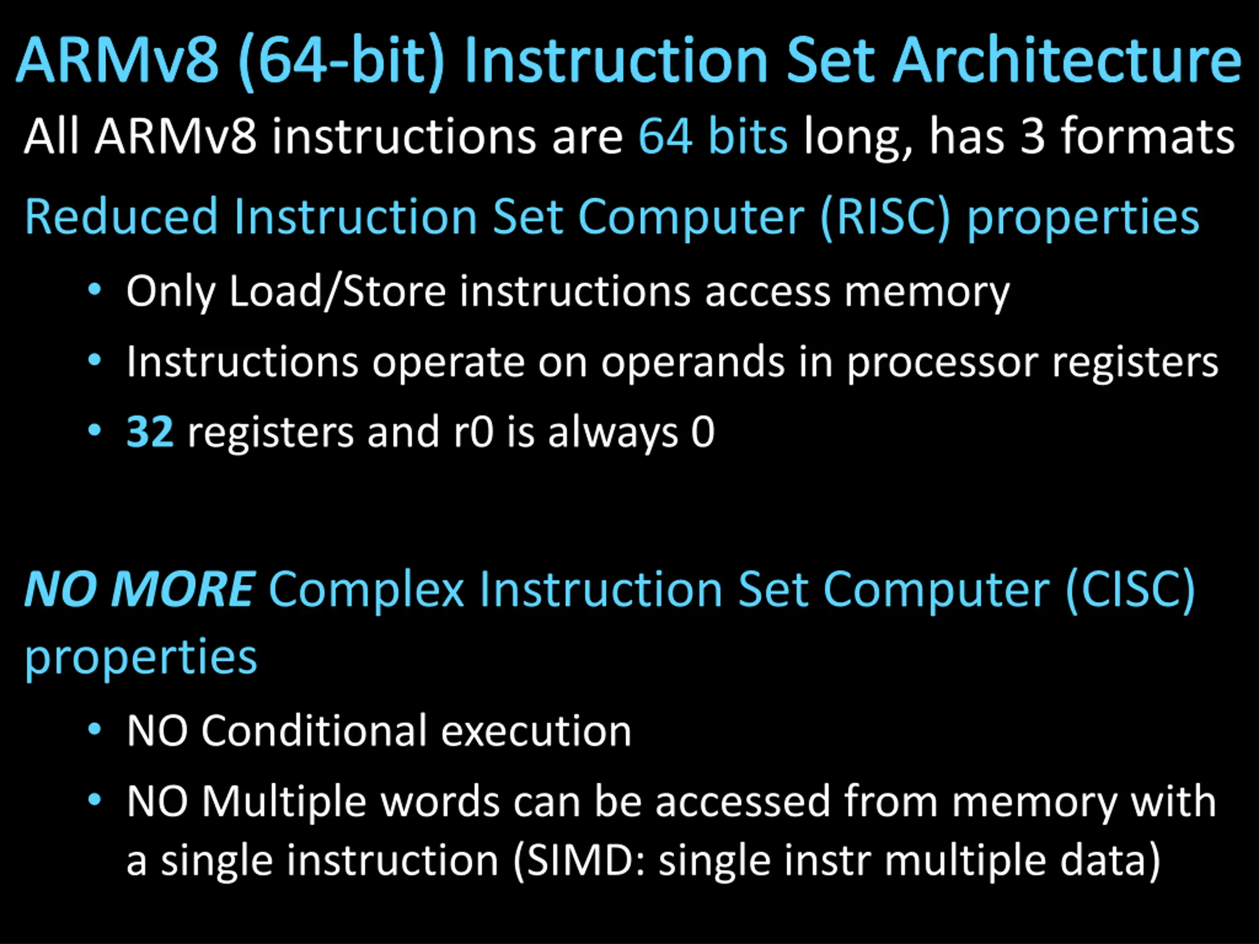 ARMv8 (64-bit) Instruction Set Architecture All ARMv8 instructions are 64 bits long, has 3 formats Reduced Instruction Set Computer (RISC) properties Only Load/Store instructions access memory Instructions operate on operands in processor registers 32 registers and r0 is always 0 NO MORE Complex Instruction Set Computer (CISC) properties NO Conditional execution NO Multiple words can be accessed from memory with a single instruction (SIMD: single instr multiple data)
