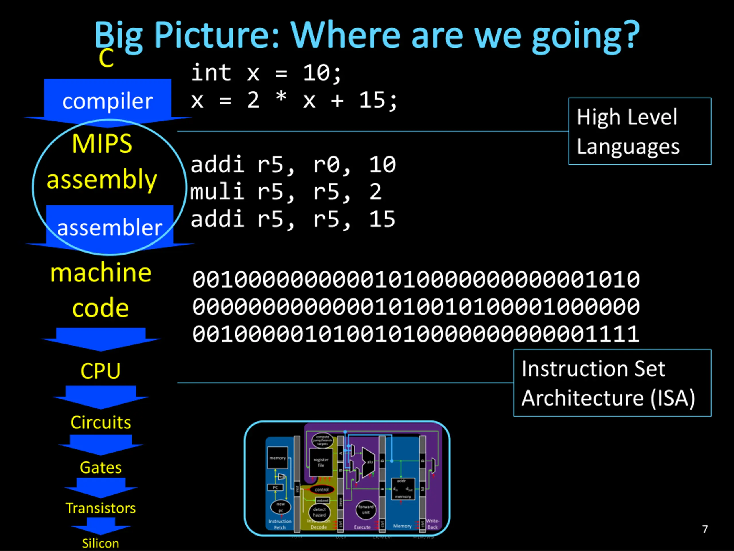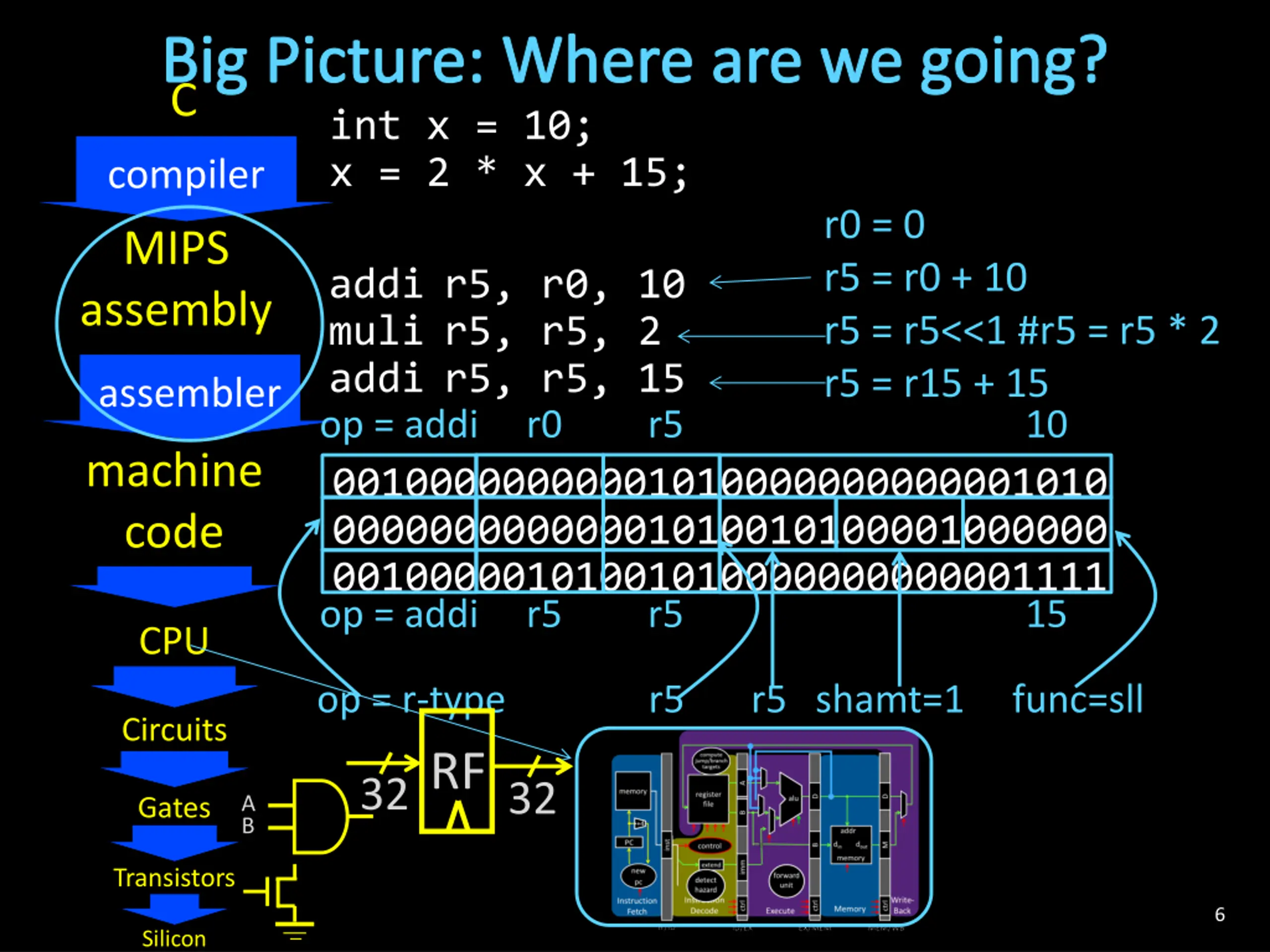 Big Picture: Where are we going? int x = 10; x = 2 * x + 15; compiler C r0 = 0 r5 = r0 + 10 r5 = r5<<1 #r5 = r5 * 2 r5 = r15 + 15 MIPS assembly addi r5, r0, 10 muli r5, r5, 2 addi r5, r5, 15 op = addi r0 r5 10 assembler machine code 00100000000001010000000000001010 00000000000001010010100001000000 00100000101001010000000000001111 op = addi r5 r5 15 CPU op = r-type r5 r5 shamt=1 func=sll RF Circuits 32 32 A B Gates Transistors 6 Silicon