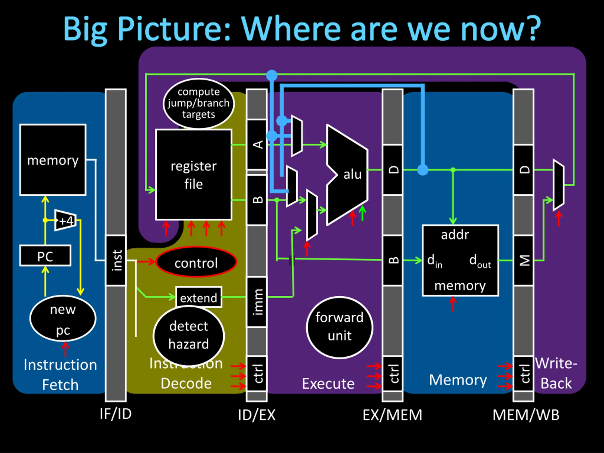 Big Picture: Where are we now? compute jump/branch targets A memory register file D D alu B +4 addr inst PC din dout M control B memory imm extend new pc forward unit detect hazard Instruction Decode Write- Back Instruction Fetch ctrl ctrl ctrl Memory Execute IF/ID ID/EX EX/MEM MEM/WB