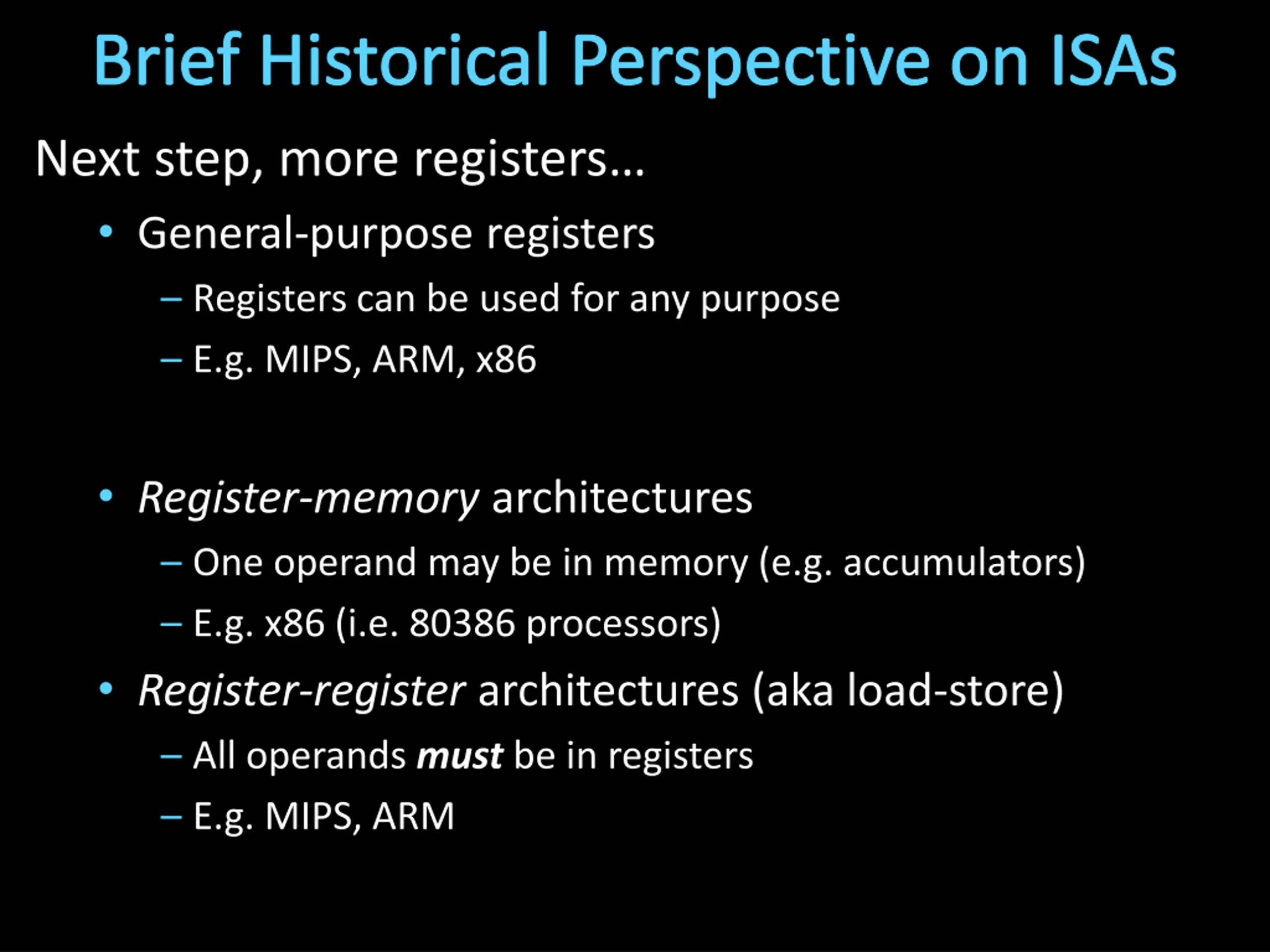 Brief Historical Perspective on ISAs Next step, more registers General-purpose registers Registers can be used for any purpose E.g. MIPS, ARM, x86 Register-memory architectures One operand may be in memory (e.g. accumulators) E.g. x86 (i.e. 80386 processors) Register-register architectures (aka load-store) All operands must be in registers E.g. MIPS, ARM