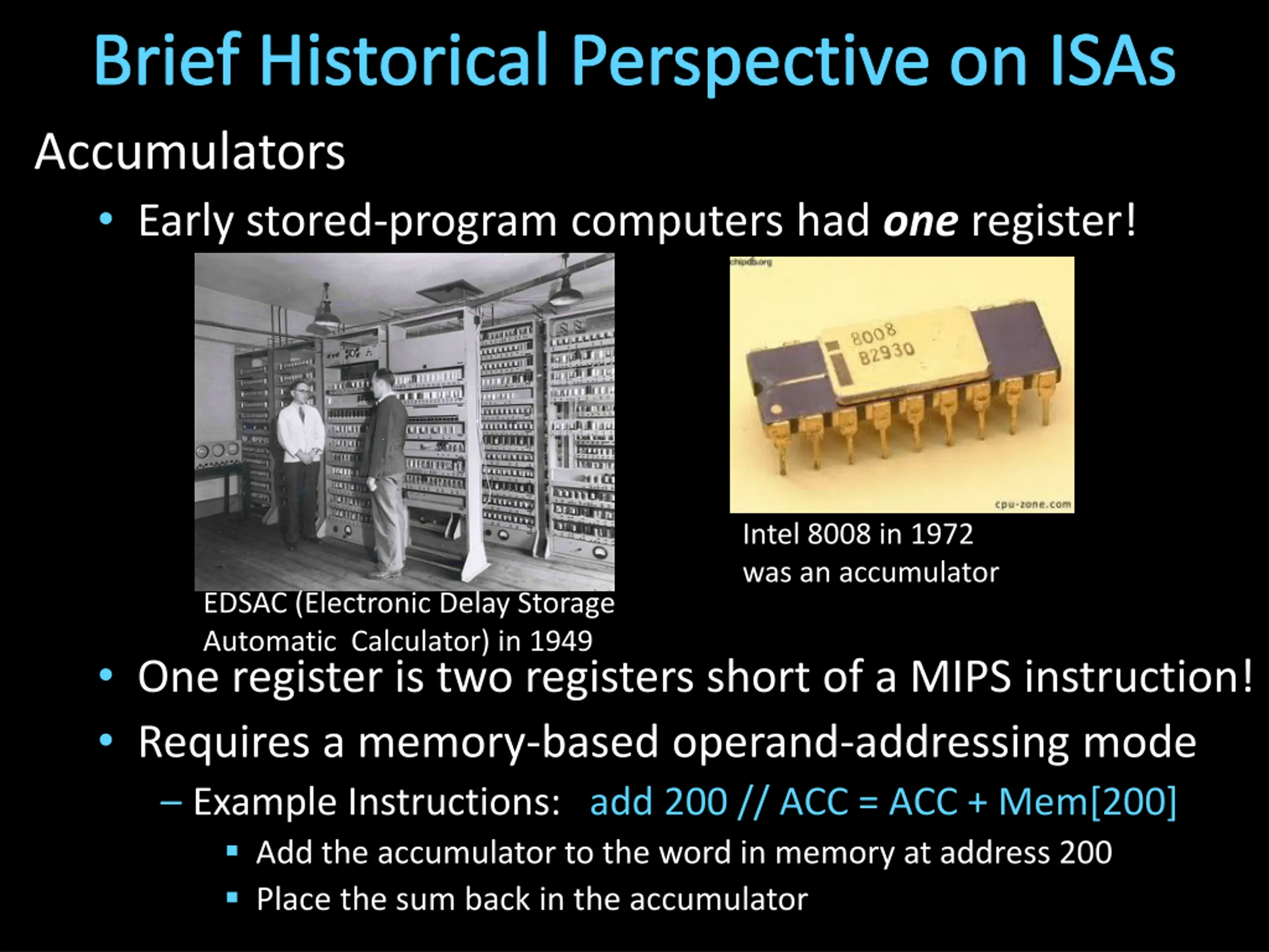 Brief Historical Perspective on ISAs Accumulators Early stored-program computers had one register! Intel 8008 in 1972 was an accumulator EDSAC (Electronic Delay Storage Automatic Calculator) in 1949 One register is two registers short of a MIPS instruction! Requires a memory-based operand-addressing mode Example Instructions: add 200 // ACC = ACC + Mem[200] Add the accumulator to the word in memory at address 200 Place the sum back in the accumulator