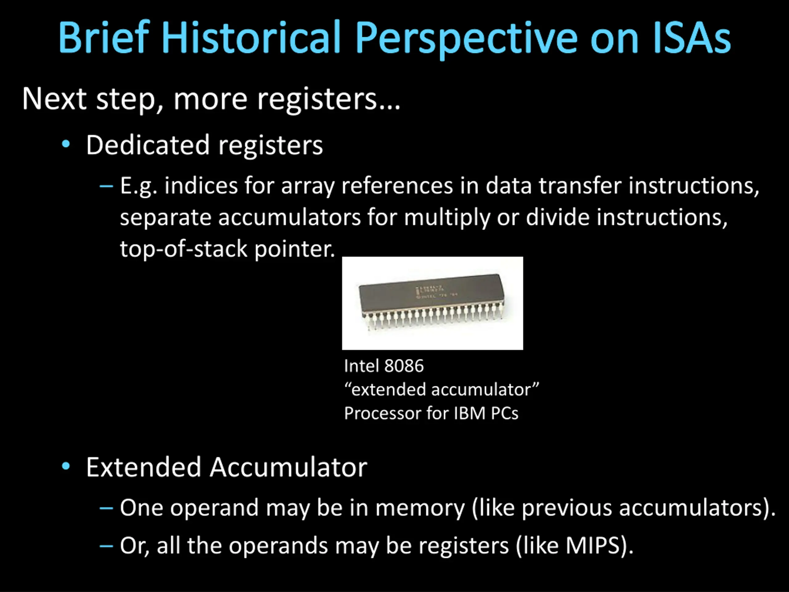 Brief Historical Perspective on ISAs Next step, more registers Dedicated registers E.g. indices for array references in data transfer instructions, separate accumulators for multiply or divide instructions, top-of-stack pointer. Intel 8086 extended accumulator Processor for IBM PCs Extended Accumulator One operand may be in memory (like previous accumulators). Or, all the operands may be registers (like MIPS).