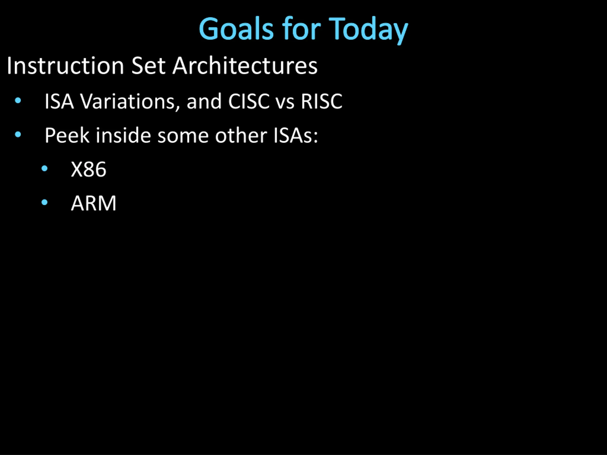 Goals for Today Instruction Set Architectures ISA Variations, and CISC vs RISC Peek inside some other ISAs: X86 ARM