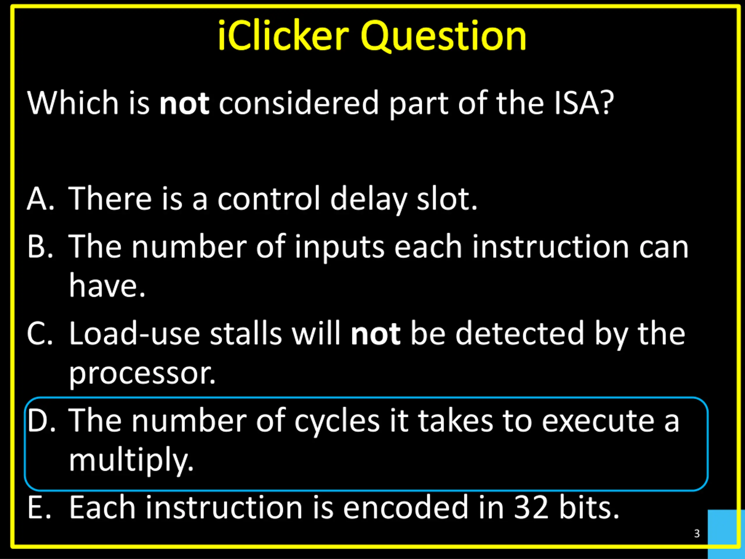 iClicker Question Which is not considered part of the ISA? A. There is a control delay slot. B. The number of inputs each instruction can have. C. Load-use stalls will not be detected by the processor. D. The number of cycles it takes to execute a multiply. E. Each instruction is encoded in 32 bits. 3