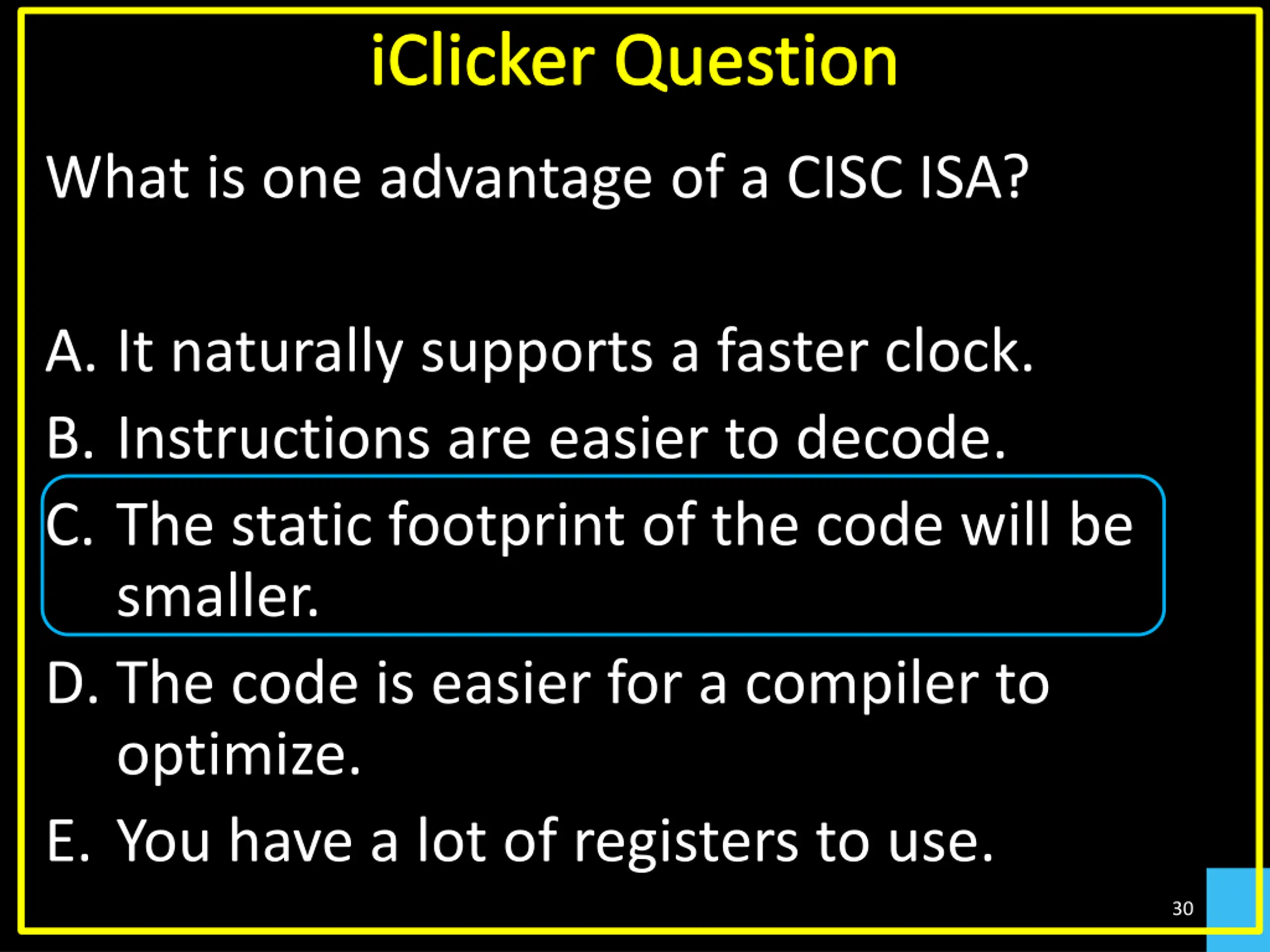 iClicker Question What is one advantage of a CISC ISA? A. It naturally supports a faster clock. B. Instructions are easier to decode. C. The static footprint of the code will be smaller. D. The code is easier for a compiler to optimize. E. You have a lot of registers to use. 30