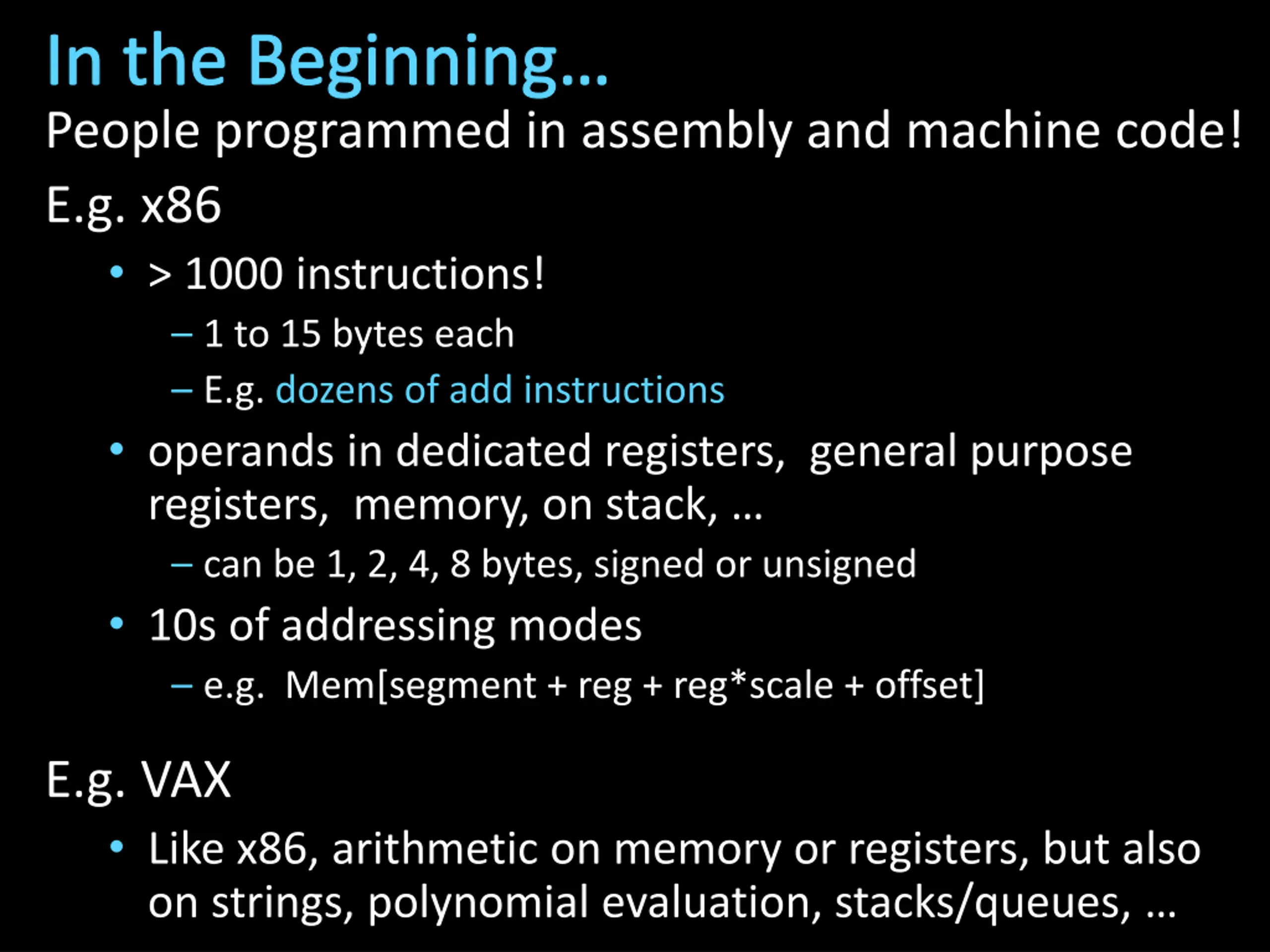 In the Beginning People programmed in assembly and machine code! E.g. x86 > 1000 instructions! 1 to 15 bytes each E.g. dozens of add instructions operands in dedicated registers, general purpose registers, memory, on stack, can be 1, 2, 4, 8 bytes, signed or unsigned 10s of addressing modes e.g. Mem[segment + reg + reg*scale + offset] E.g. VAX Like x86, arithmetic on memory or registers, but also on strings, polynomial evaluation, stacks/queues,