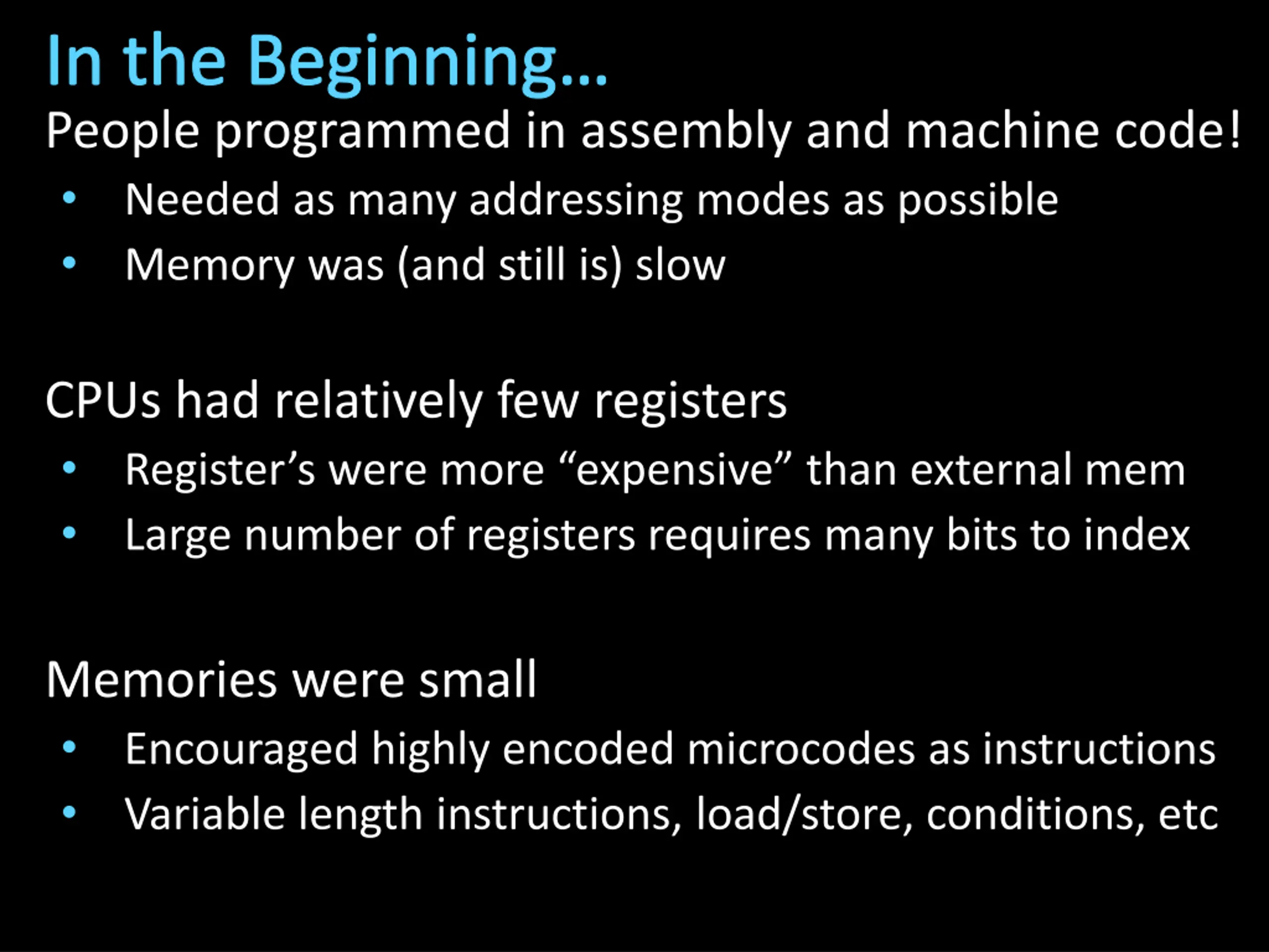 In the Beginning People programmed in assembly and machine code! Needed as many addressing modes as possible Memory was (and still is) slow CPUs had relatively few registers Register s were more expensive than external mem Large number of registers requires many bits to index Memories were small Encouraged highly encoded microcodes as instructions Variable length instructions, load/store, conditions, etc