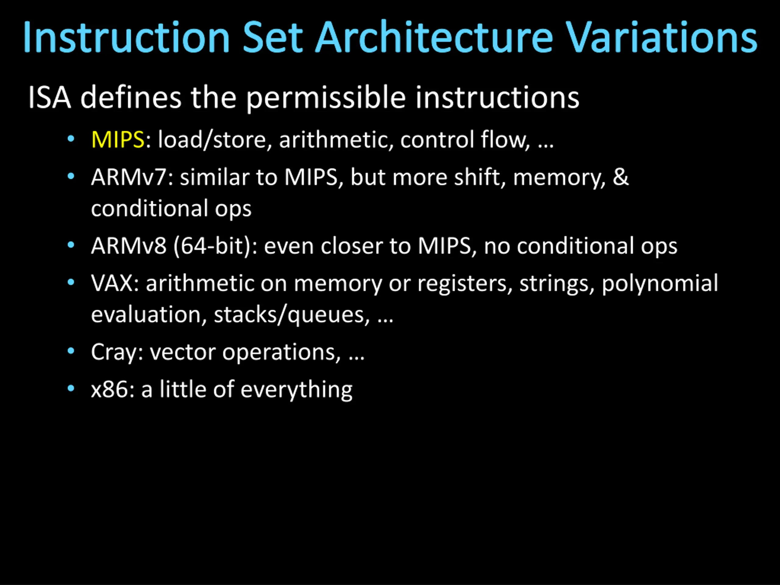 Instruction Set Architecture Variations ISA defines the permissible instructions MIPS: load/store, arithmetic, control flow, ARMv7: similar to MIPS, but more shift, memory, & conditional ops ARMv8 (64-bit): even closer to MIPS, no conditional ops VAX: arithmetic on memory or registers, strings, polynomial evaluation, stacks/queues, Cray: vector operations, x86: a little of everything