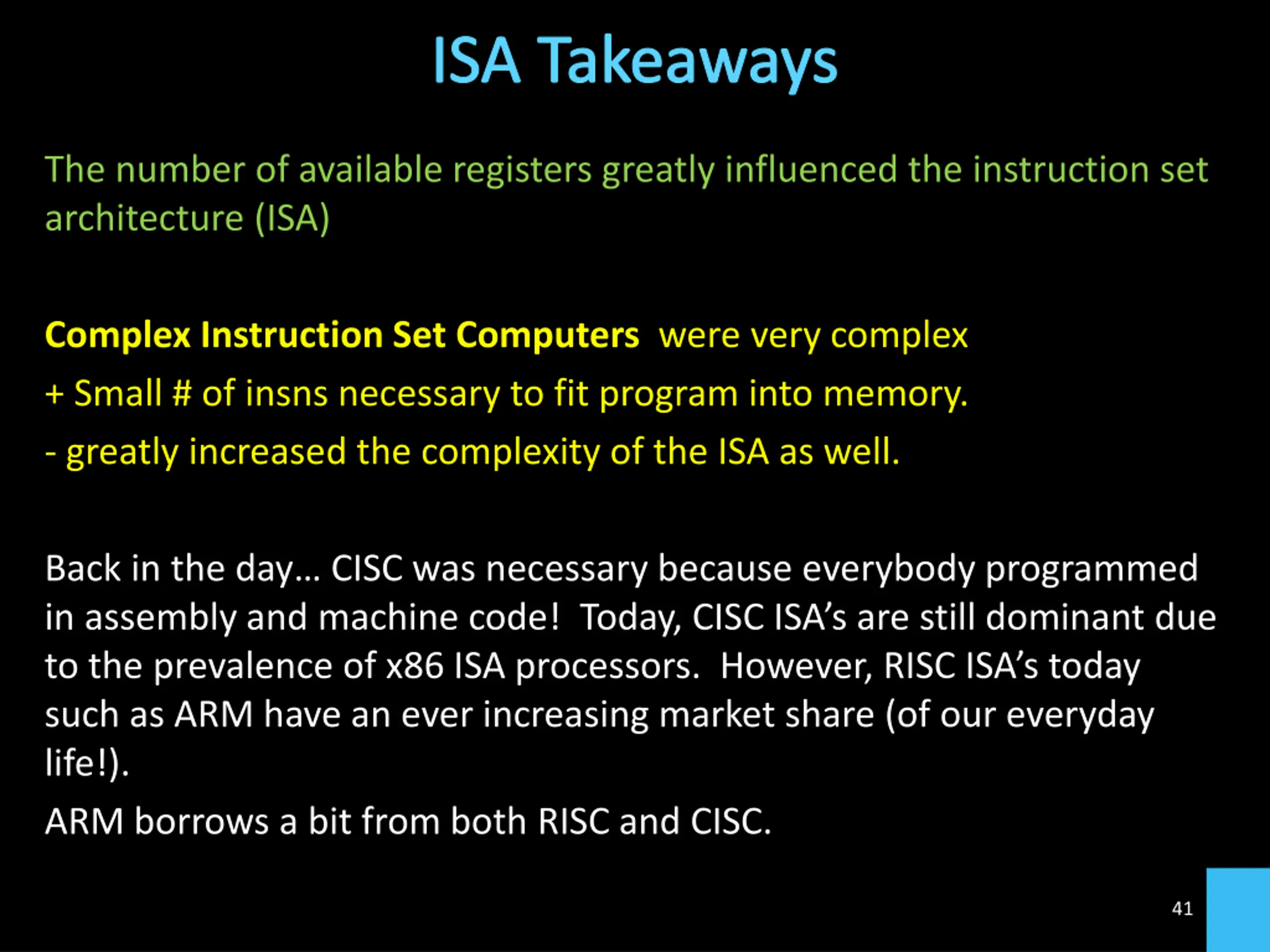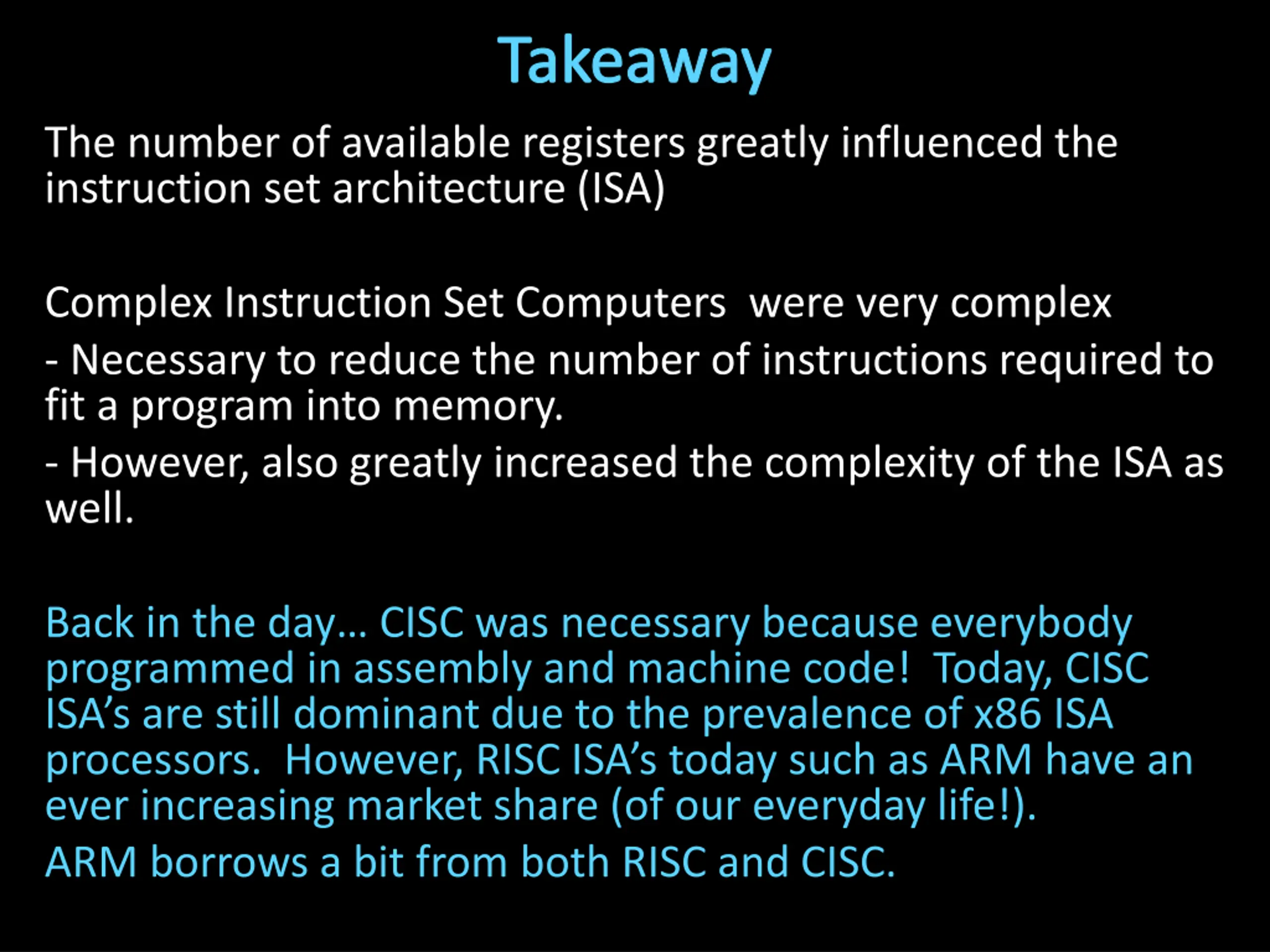 Takeaway The number of available registers greatly influenced the instruction set architecture (ISA) Complex Instruction Set Computers were very complex - Necessary to reduce the number of instructions required to fit a program into memory. - However, also greatly increased the complexity of the ISA as well. Back in the day CISC was necessary because everybody programmed in assembly and machine code! Today, CISC ISA s are still dominant due to the prevalence of x86 ISA processors. However, RISC ISA s today such as ARM have an ever increasing market share (of our everyday life!). ARM borrows a bit from both RISC and CISC.