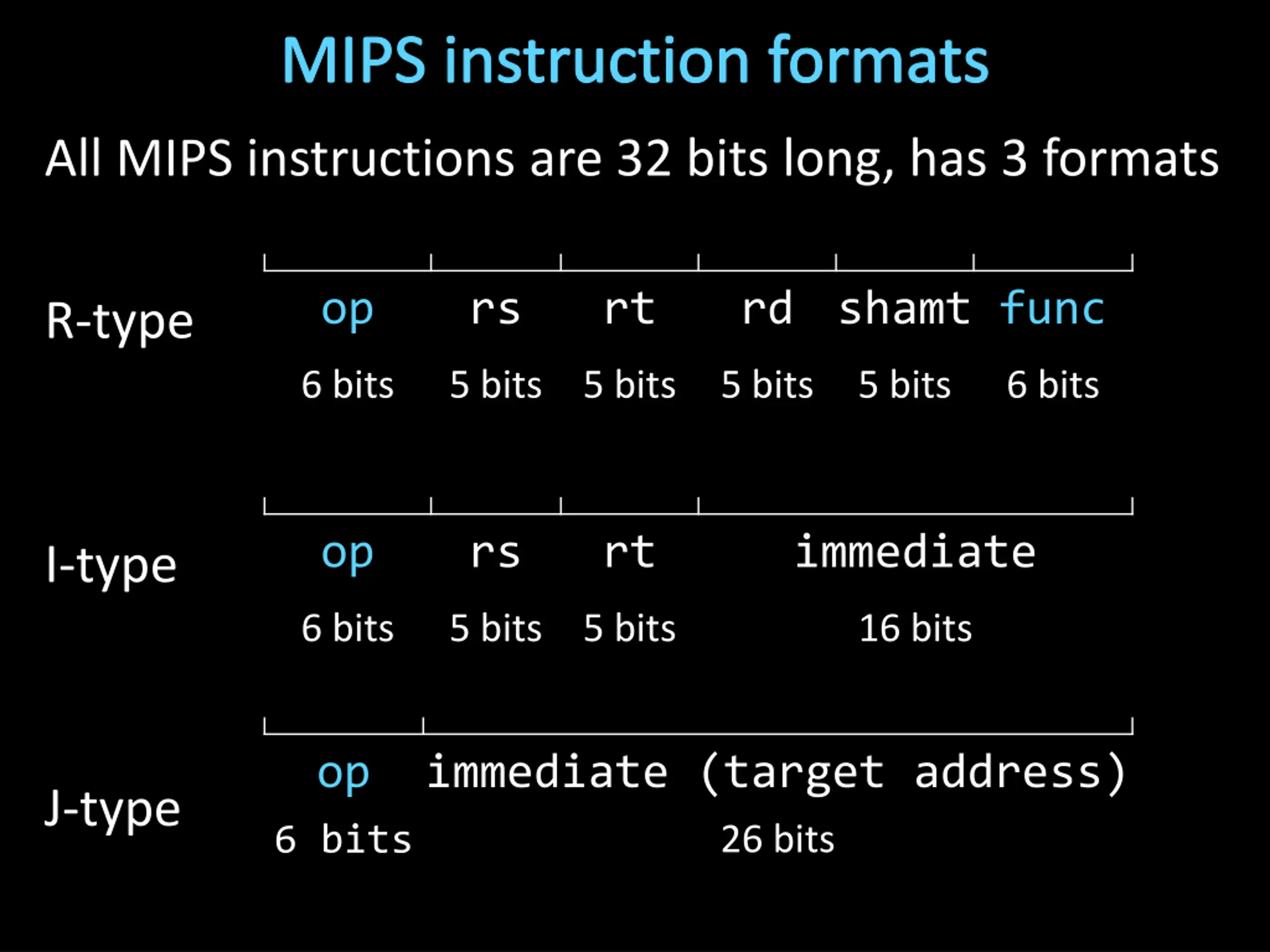 MIPS instruction formats All MIPS instructions are 32 bits long, has 3 formats op rs rt rd shamt func R-type 6 bits 5 bits 5 bits 5 bits 5 bits 6 bits op rs rt immediate I-type 6 bits 5 bits 5 bits 16 bits op immediate (target address) 26 bits J-type 6 bits