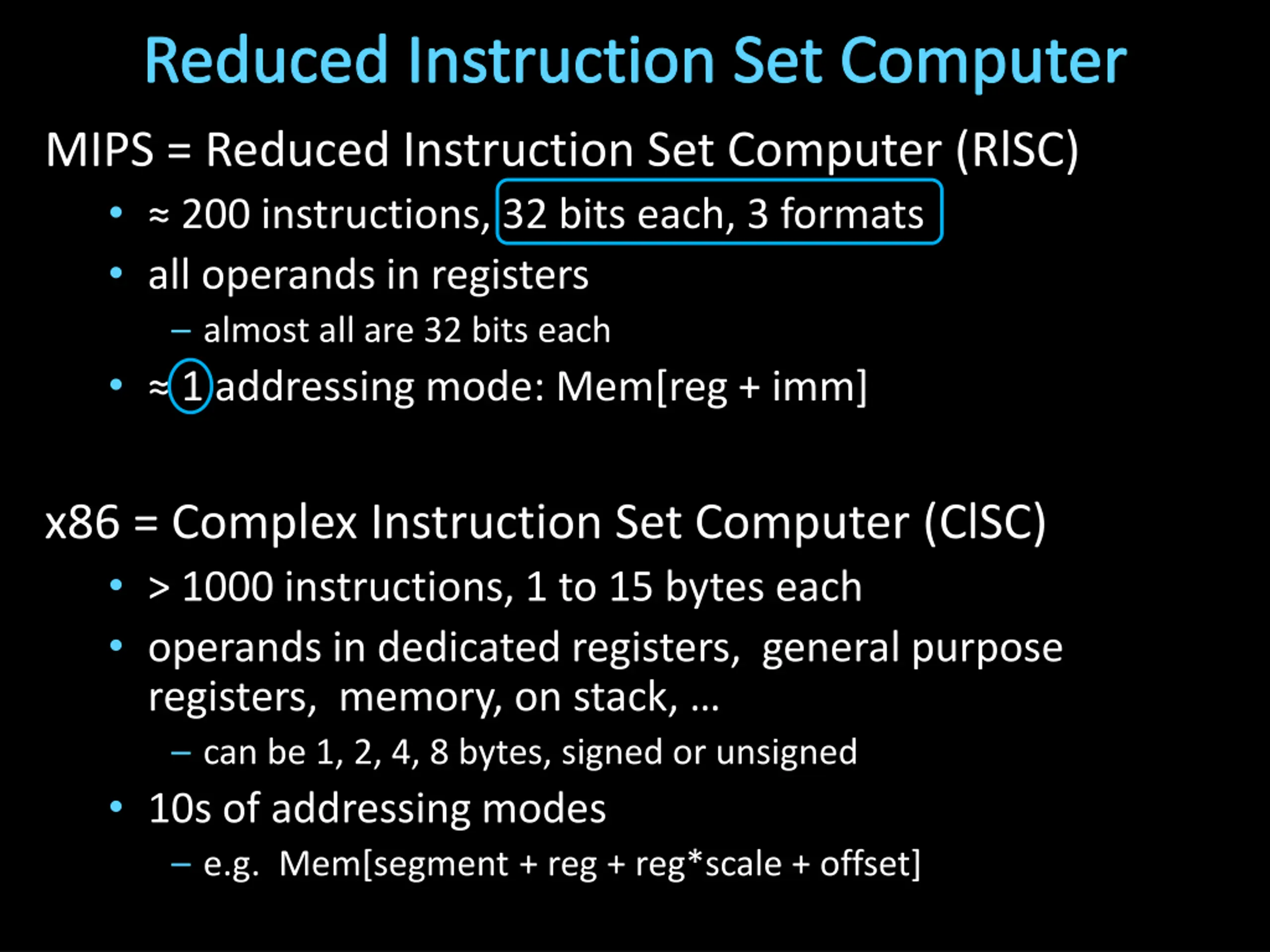 Reduced Instruction Set Computer MIPS = Reduced Instruction Set Computer (RlSC) 200 instructions, 32 bits each, 3 formats all operands in registers almost all are 32 bits each 1 addressing mode: Mem[reg + imm] x86 = Complex Instruction Set Computer (ClSC) > 1000 instructions, 1 to 15 bytes each operands in dedicated registers, general purpose registers, memory, on stack, can be 1, 2, 4, 8 bytes, signed or unsigned 10s of addressing modes e.g. Mem[segment + reg + reg*scale + offset]
