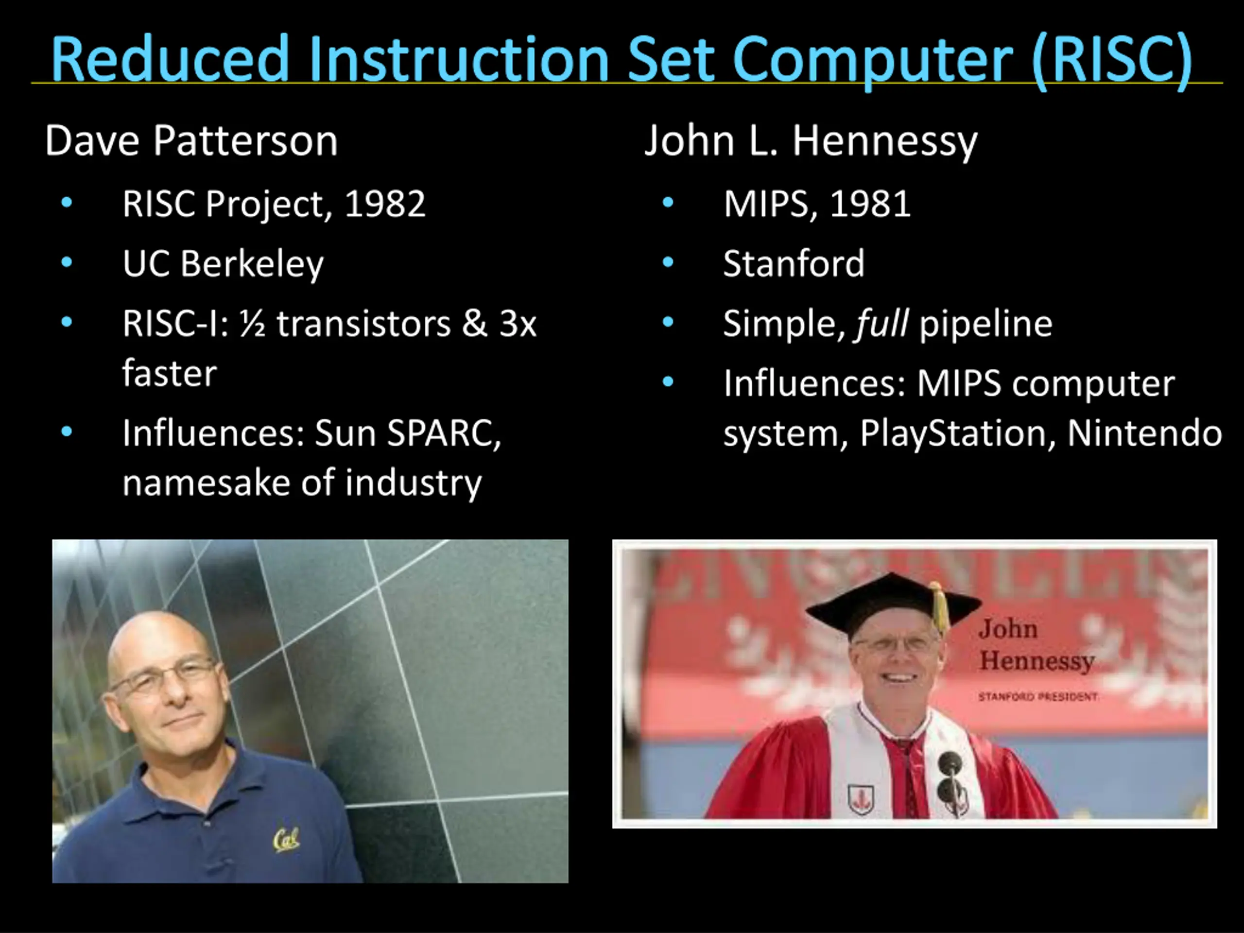 Reduced Instruction Set Computer (RISC) Dave Patterson RISC Project, 1982 UC Berkeley RISC-I: transistors & 3x faster Influences: Sun SPARC, namesake of industry John L. Hennessy MIPS, 1981 Stanford Simple, full pipeline Influences: MIPS computer system, PlayStation, Nintendo
