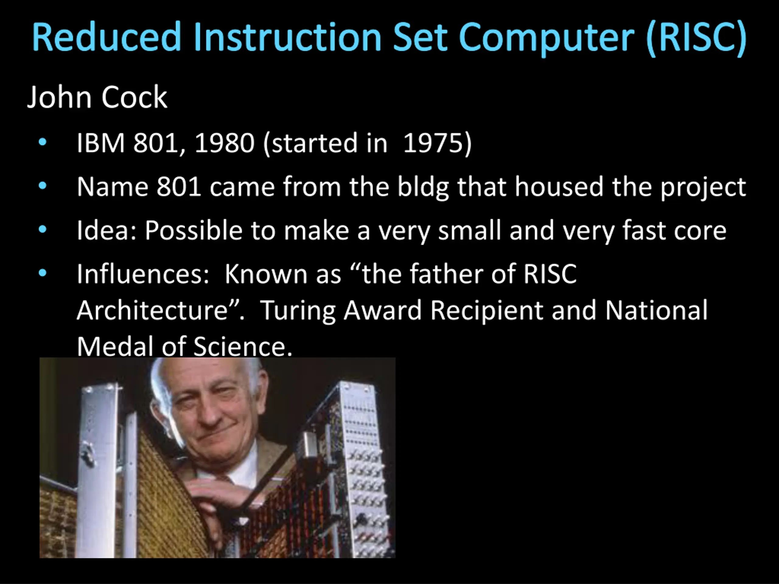 Reduced Instruction Set Computer (RISC) John Cock IBM 801, 1980 (started in 1975) Name 801 came from the bldg that housed the project Idea: Possible to make a very small and very fast core Influences: Known as the father of RISC Architecture . Turing Award Recipient and National Medal of Science.