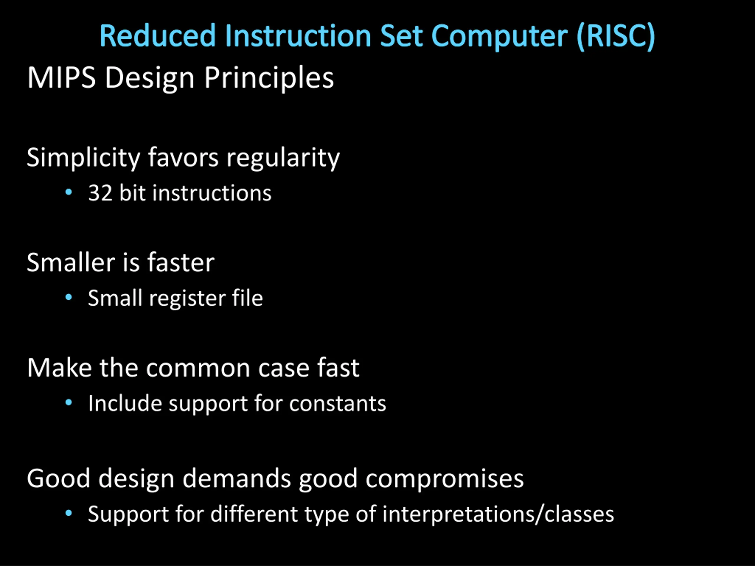 Reduced Instruction Set Computer (RISC) MIPS Design Principles Simplicity favors regularity 32 bit instructions Smaller is faster Small register file Make the common case fast Include support for constants Good design demands good compromises Support for different type of interpretations/classes