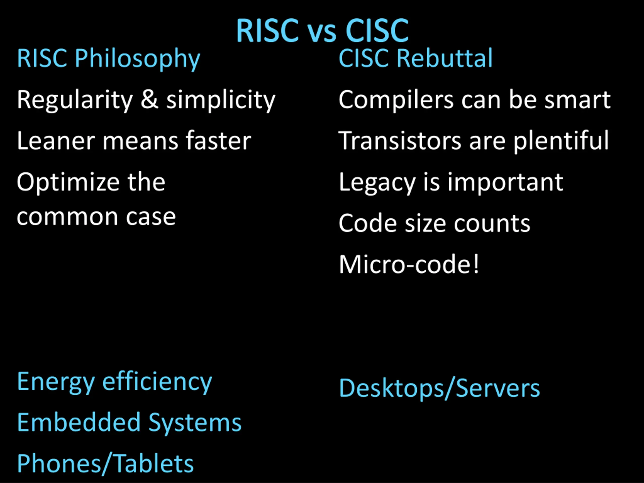 RISC vs CISC RISC Philosophy Regularity & simplicity Leaner means faster Optimize the common case CISC Rebuttal Compilers can be smart Transistors are plentiful Legacy is important Code size counts Micro-code! Energy efficiency Embedded Systems Phones/Tablets Desktops/Servers