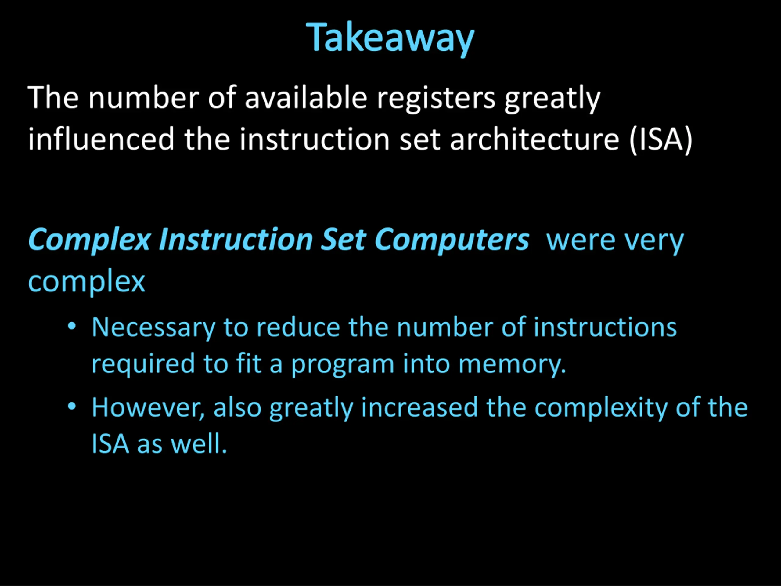 Takeaway The number of available registers greatly influenced the instruction set architecture (ISA) Complex Instruction Set Computers were very complex Necessary to reduce the number of instructions required to fit a program into memory. However, also greatly increased the complexity of the ISA as well.