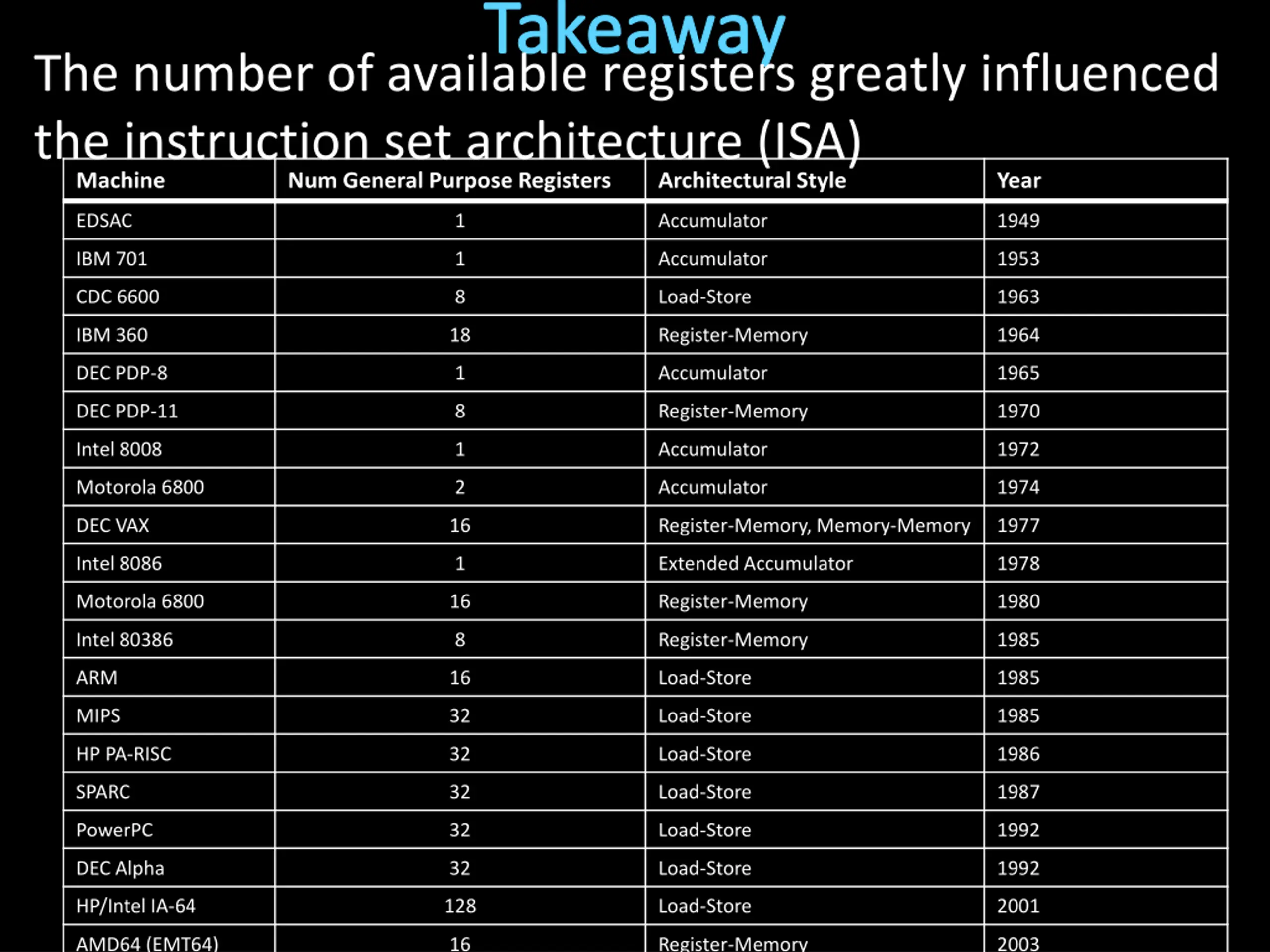 Takeaway The number of available registers greatly influenced the instruction set architecture (ISA) Machine Num General Purpose Registers Architectural Style Year EDSAC 1 Accumulator 1949 IBM 701 1 Accumulator 1953 CDC 6600 8 Load-Store 1963 IBM 360 18 Register-Memory 1964 DEC PDP-8 1 Accumulator 1965 DEC PDP-11 8 Register-Memory 1970 Intel 8008 1 Accumulator 1972 Motorola 6800 2 Accumulator 1974 DEC VAX 16 Register-Memory, Memory-Memory 1977 Intel 8086 1 Extended Accumulator 1978 Motorola 6800 16 Register-Memory 1980 Intel 80386 8 Register-Memory 1985 ARM 16 Load-Store 1985 MIPS 32 Load-Store 1985 HP PA-RISC 32 Load-Store 1986 SPARC 32 Load-Store 1987 PowerPC 32 Load-Store 1992 DEC Alpha 32 Load-Store 1992 HP/Intel IA-64 128 Load-Store 2001 AMD64 (EMT64) 16 Register-Memory 2003