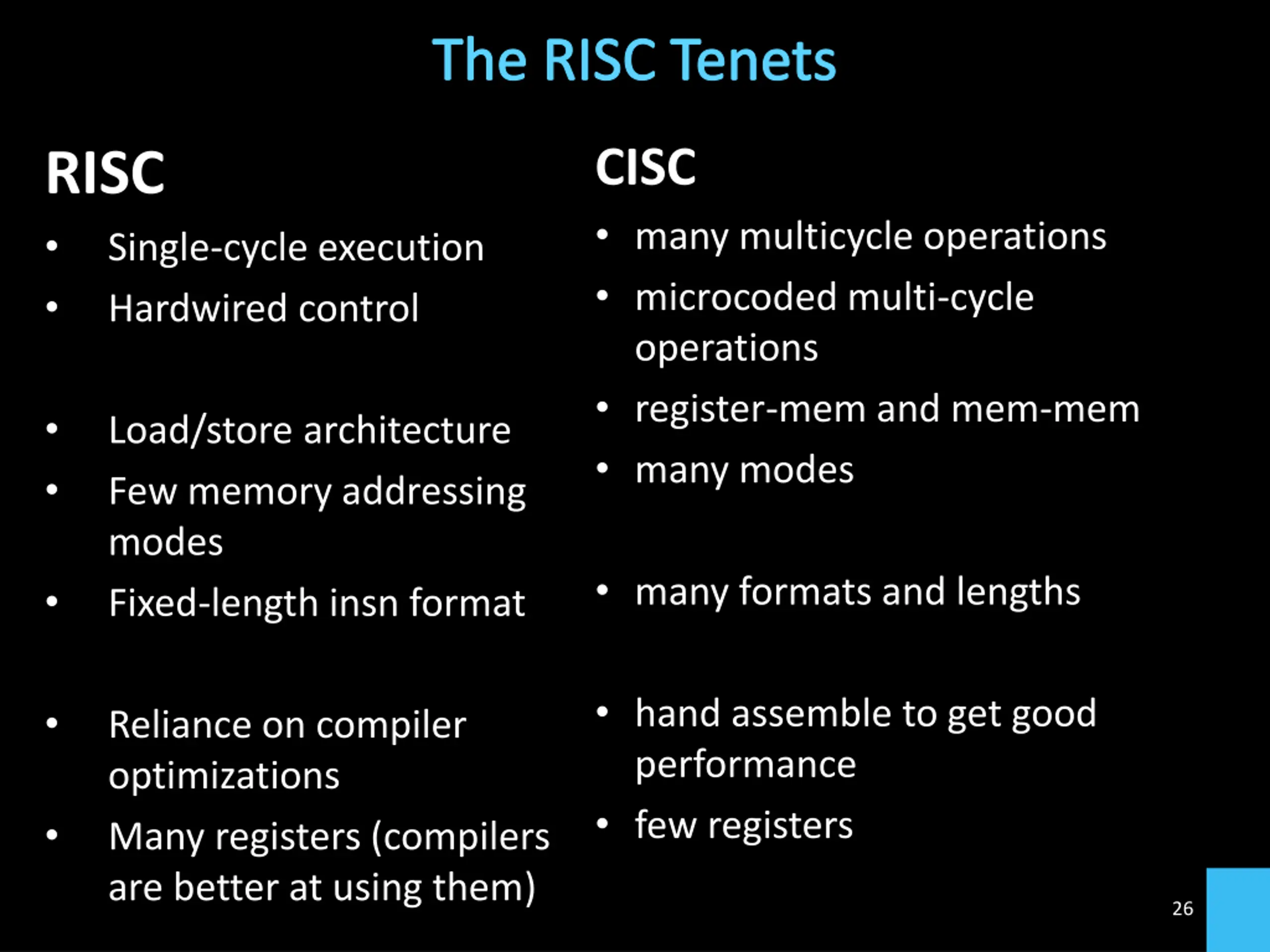 The RISC Tenets CISC many multicycle operations microcoded multi-cycle operations register-mem and mem-mem many modes RISC Single-cycle execution Hardwired control Load/store architecture Few memory addressing modes Fixed-length insn format many formats and lengths hand assemble to get good performance few registers Reliance on compiler optimizations Many registers (compilers are better at using them) 26