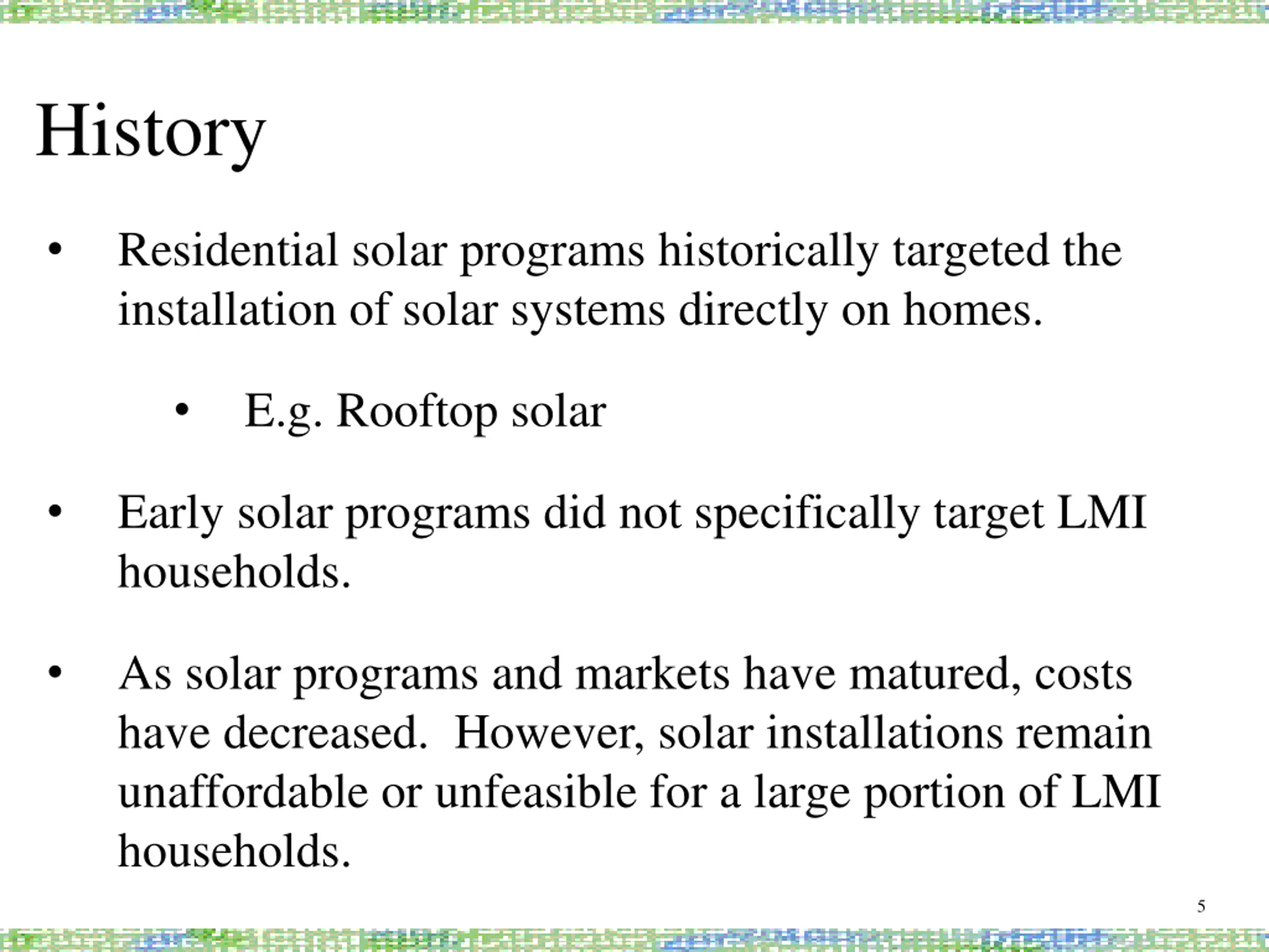 History Residential solar programs historically targeted the installation of solar systems directly on homes. E.g. Rooftop solar Early solar programs did not specifically target LMI households. As solar programs and markets have matured, costs have decreased. However, solar installations remain unaffordable or unfeasible for a large portion of LMI households. 5