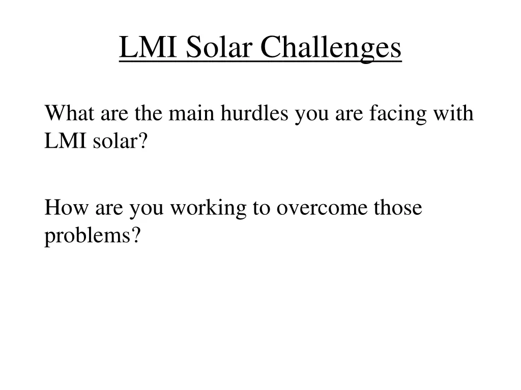 LMI Solar Challenges What are the main hurdles you are facing with LMI solar? How are you working to overcome those problems?
