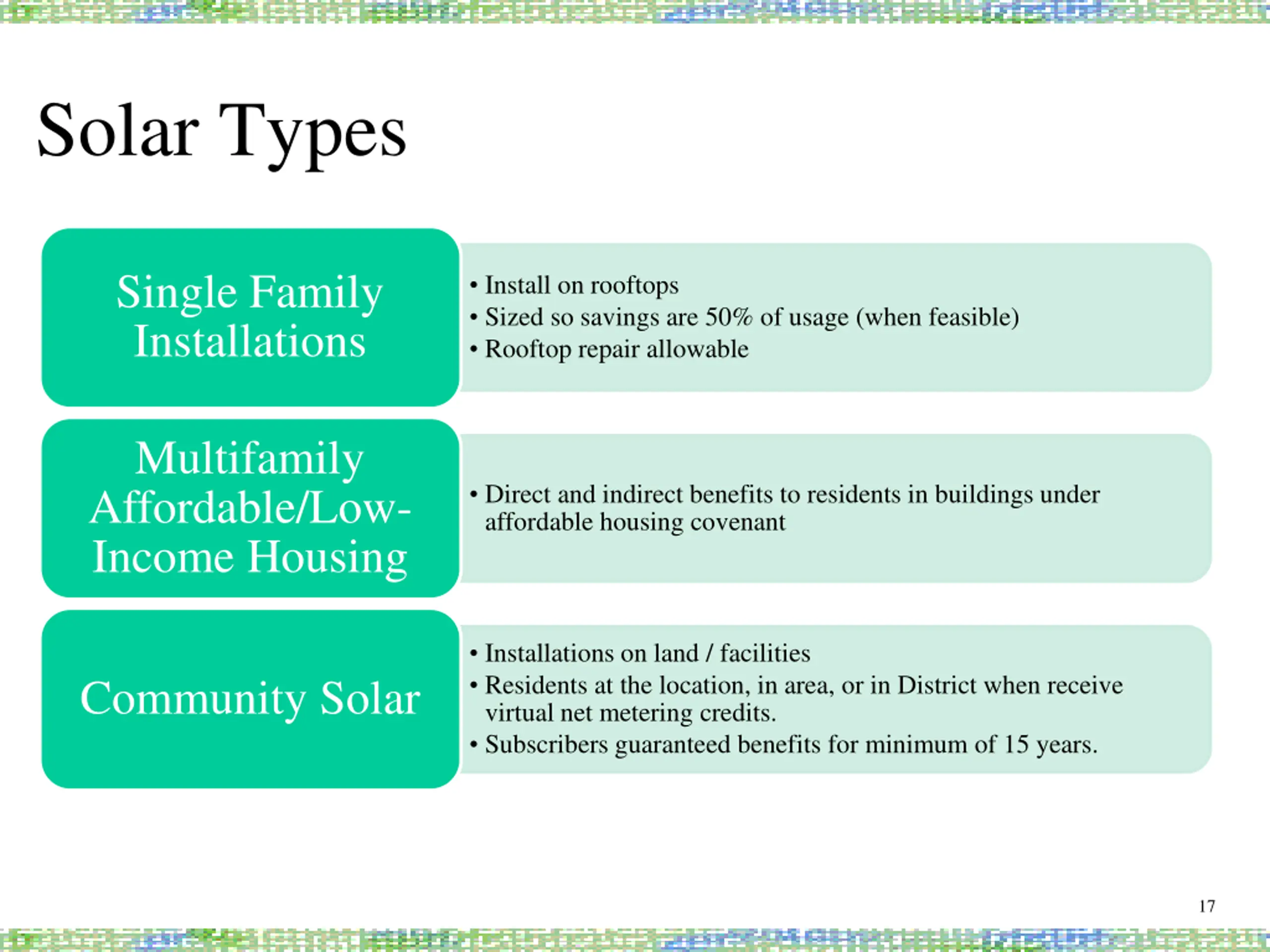 Solar Types Single Family Installations Install on rooftops Sized so savings are 50% of usage (when feasible) Rooftop repair allowable Multifamily Affordable/Low- Income Housing Direct and indirect benefits to residents in buildings under affordable housing covenant Installations on land / facilities Residents at the location, in area, or in District when receive virtual net metering credits. Subscribers guaranteed benefits for minimum of 15 years. Community Solar 17