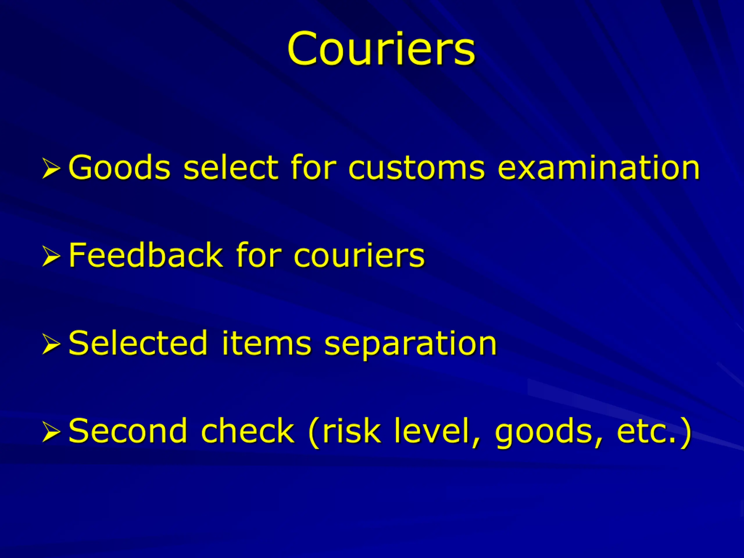 Couriers Goods select for customs examination Feedback for couriers Selected items separation Second check (risk level, goods, etc.)